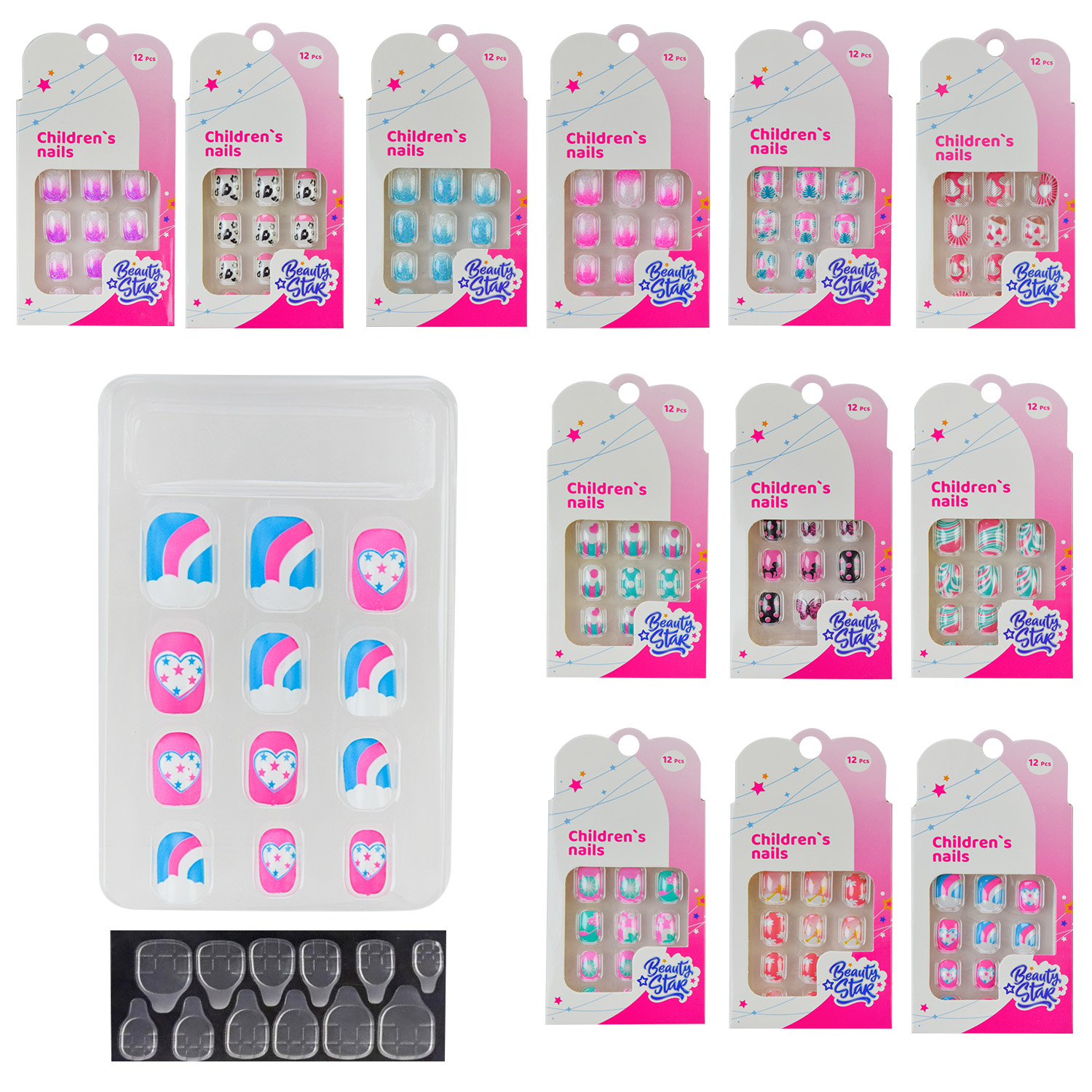 Артикул: PL523-001Аксессуари для дівчаток Beauty star арт. PL523-001 (480шт) 40 уп 12 шт нігті накладні, на самоклейкій основі, мікс 12 видів, ціна за 1 шт короб. 7*11см