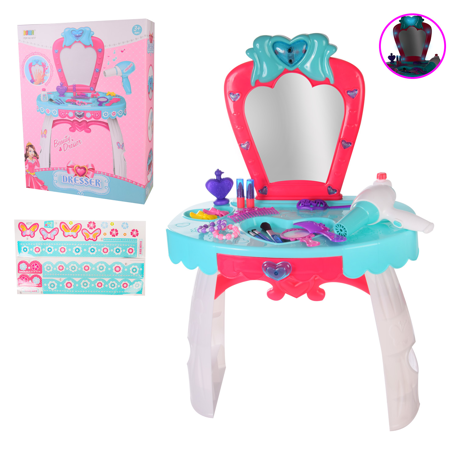 Артикул: 661-125Туалетний арт. столик 661-125 (18шт/2) батар,світло-зв. від волш.палички,фен,гребінець,біжу. короб. 26*26,5*32см