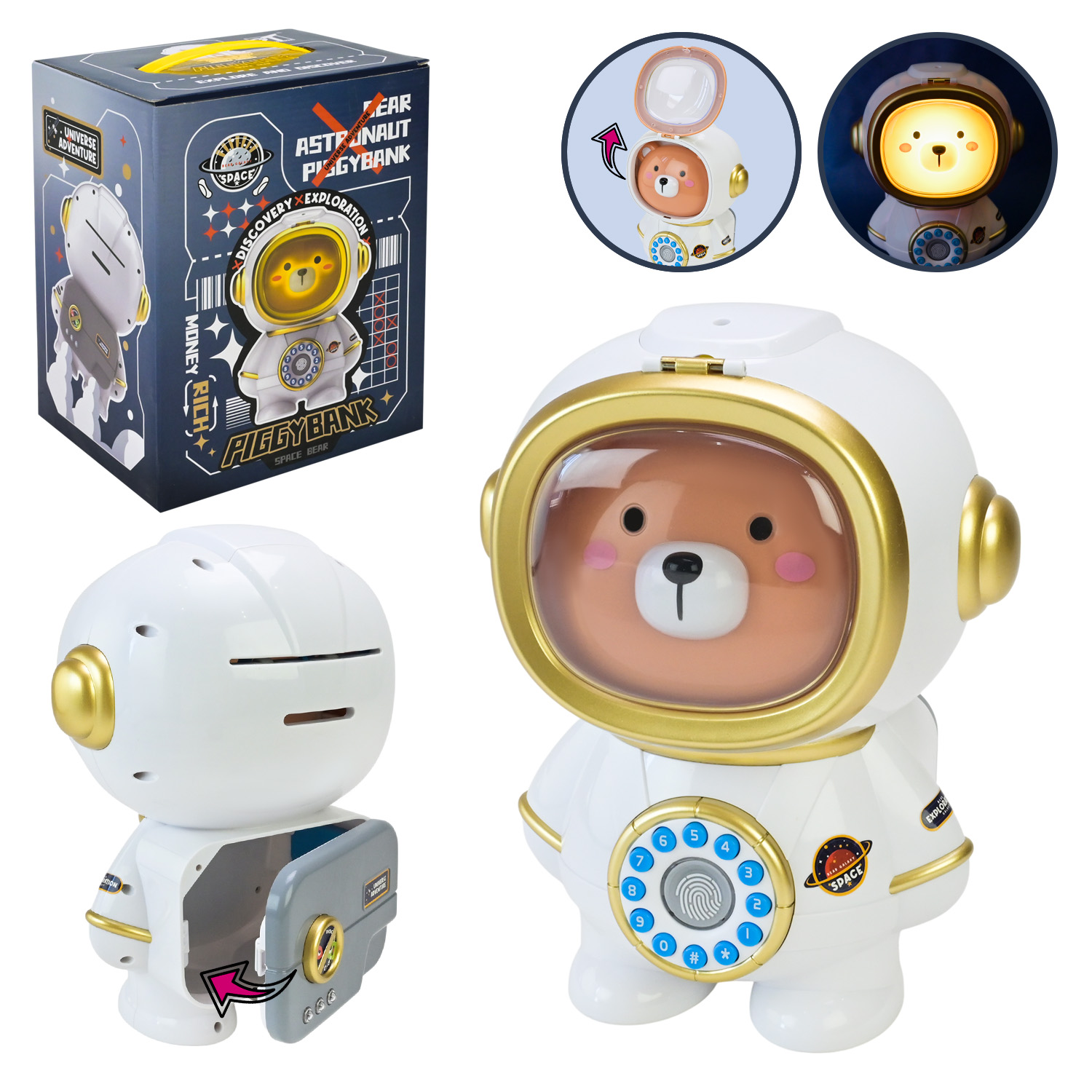Артикул: 630Скарбничка-сейф електрон. муз. арт. 630 (12шт/2) ведмедик-космонавт, муз, світло, нічник, короб.20*16*26 см