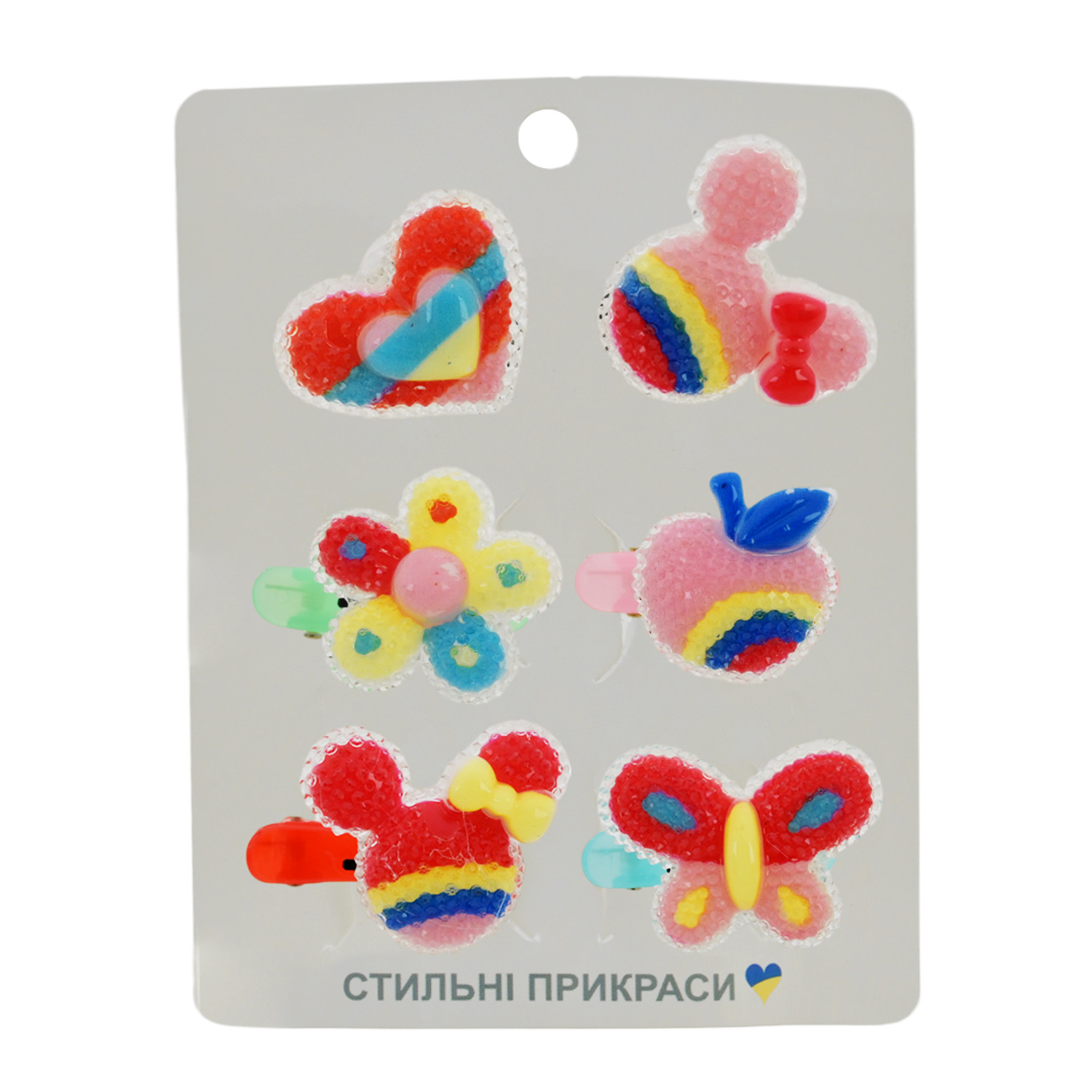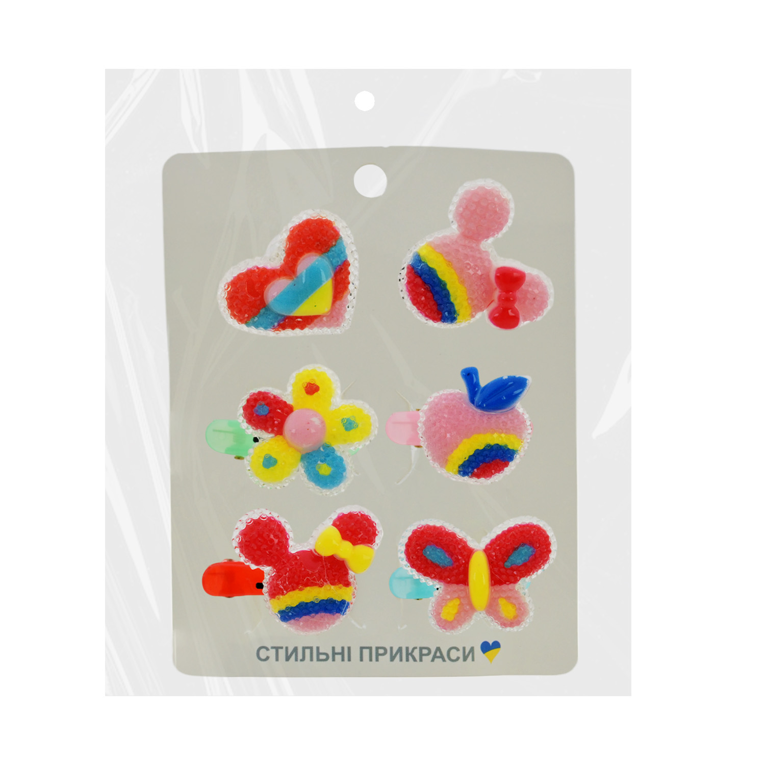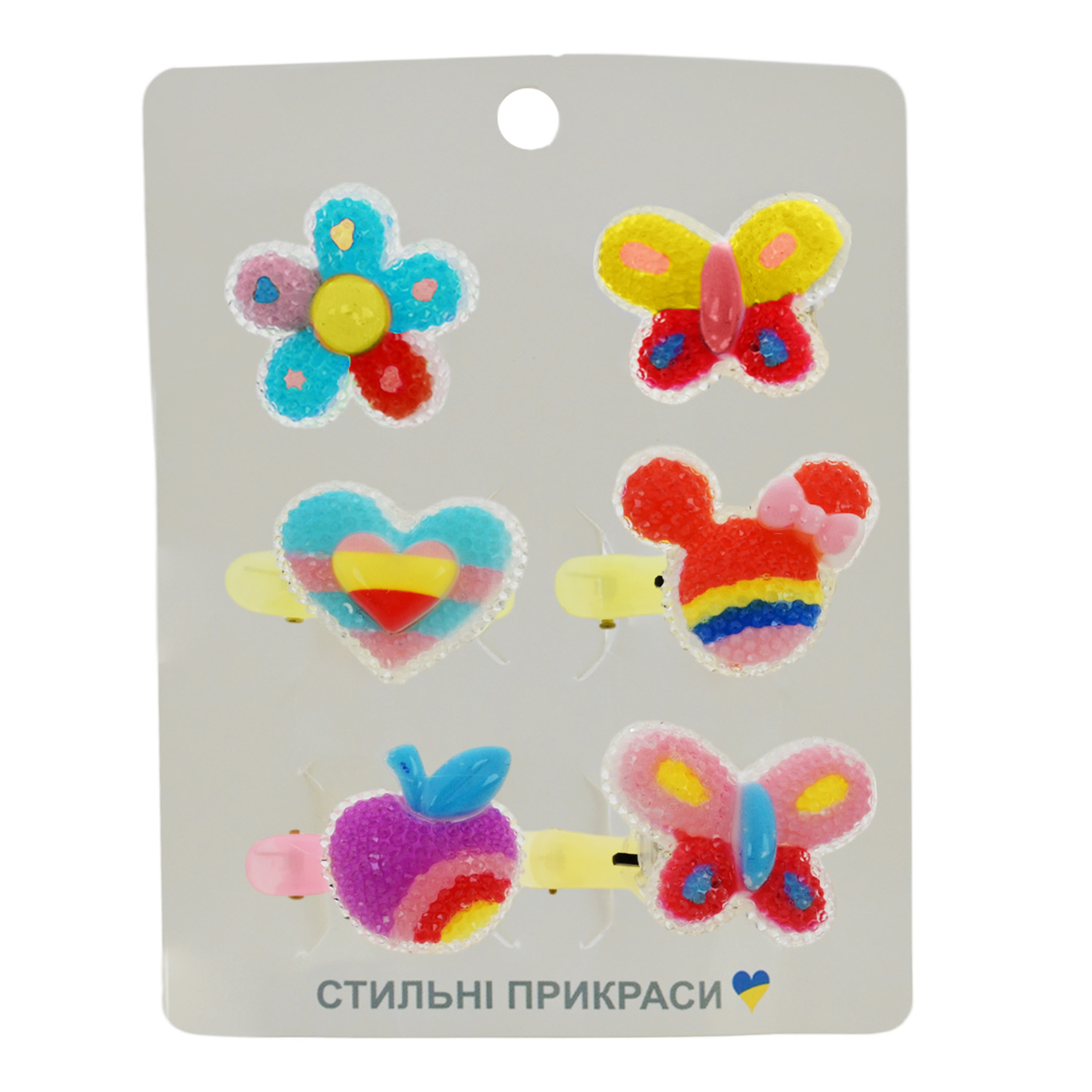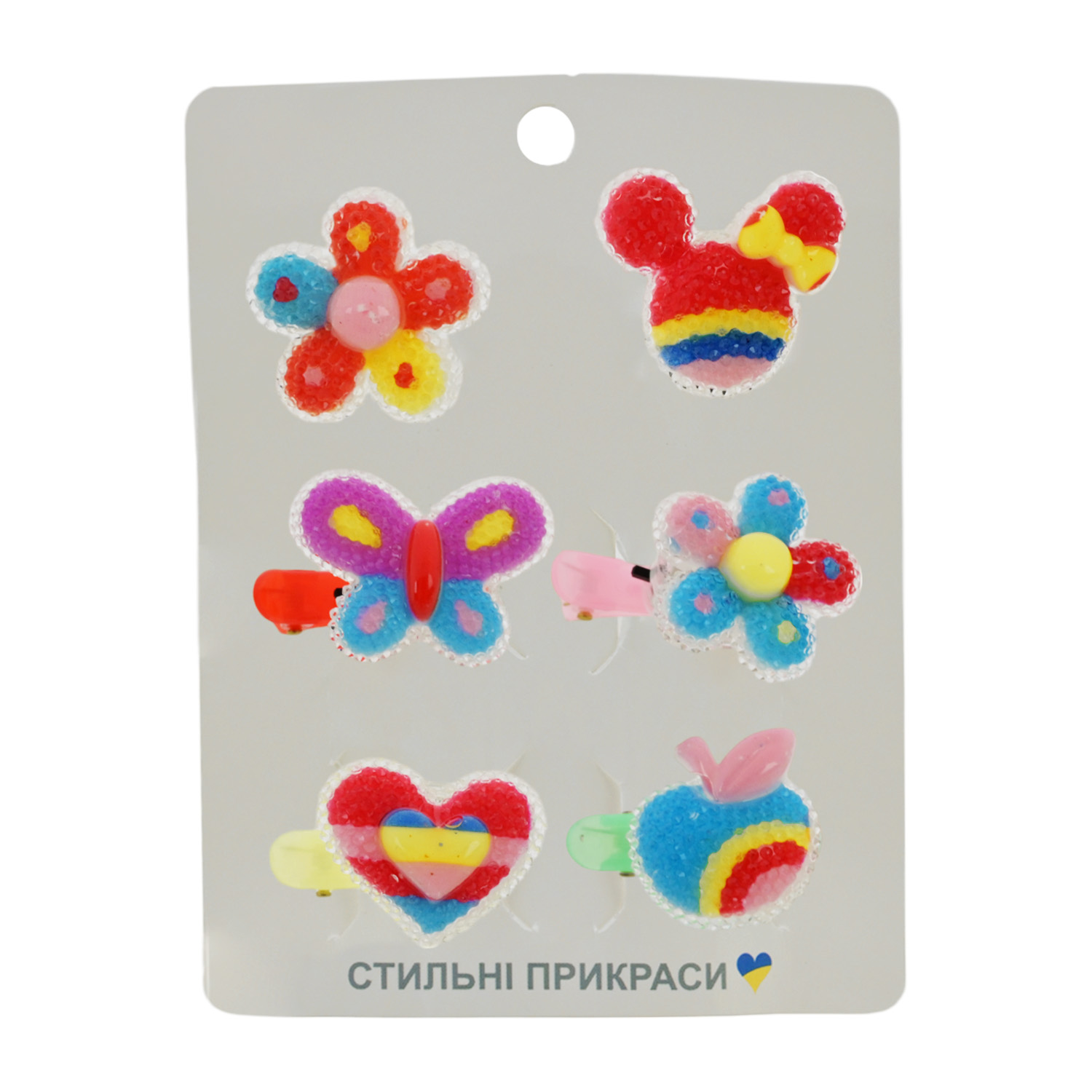 В упаковці знаходиться мікс видів. Комплектація набору – кільця 2 шт. та заколки для волосся – 4 шт. Кожна заколку та кільце прикрашає яскрава квіточка або ягідка.