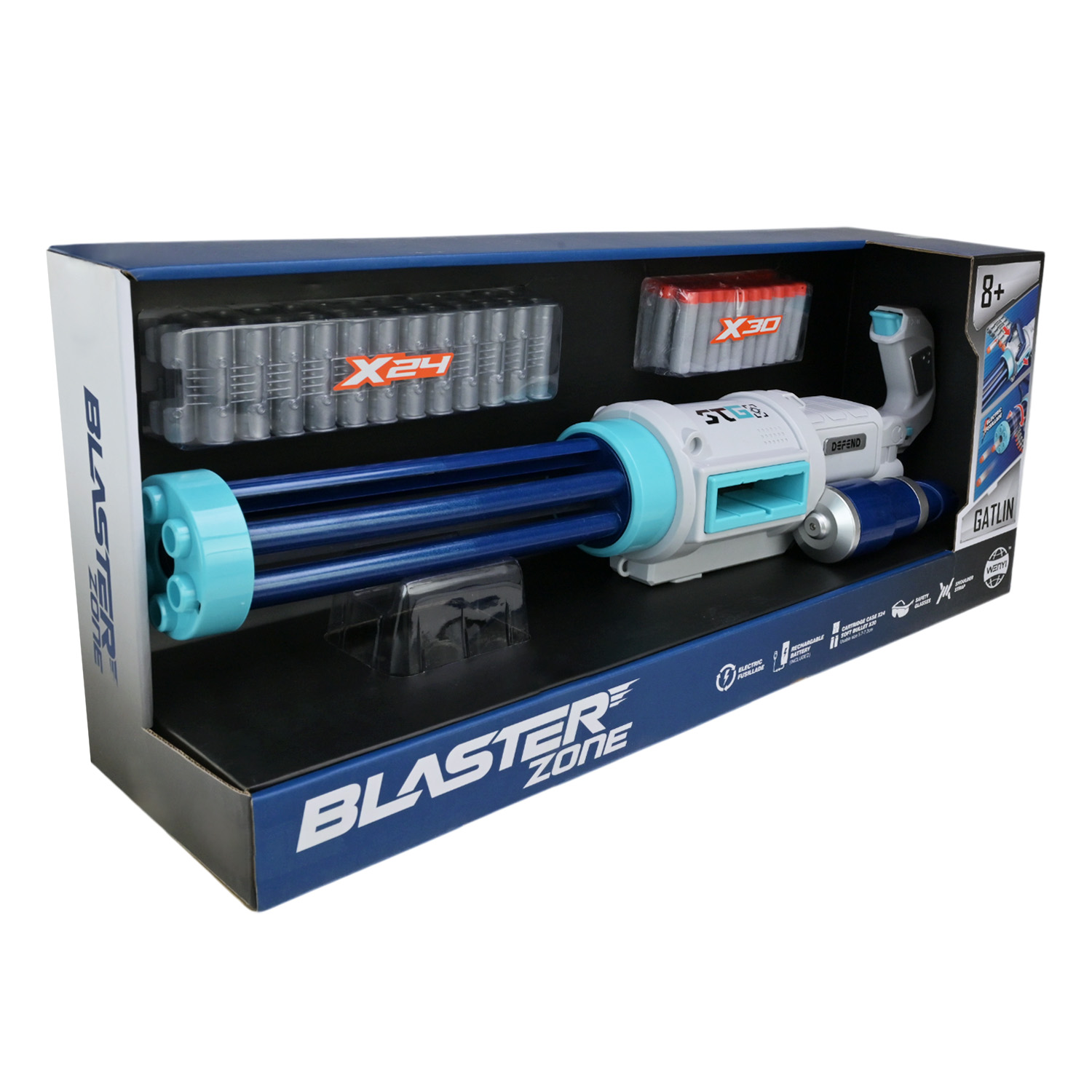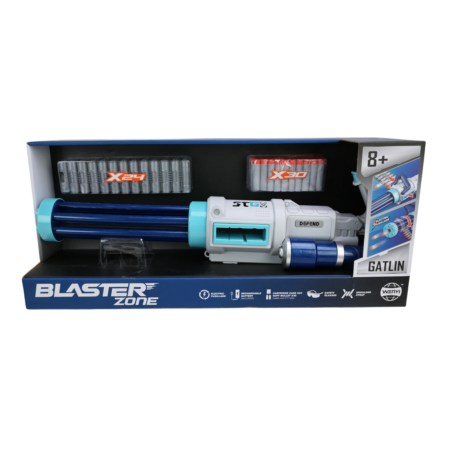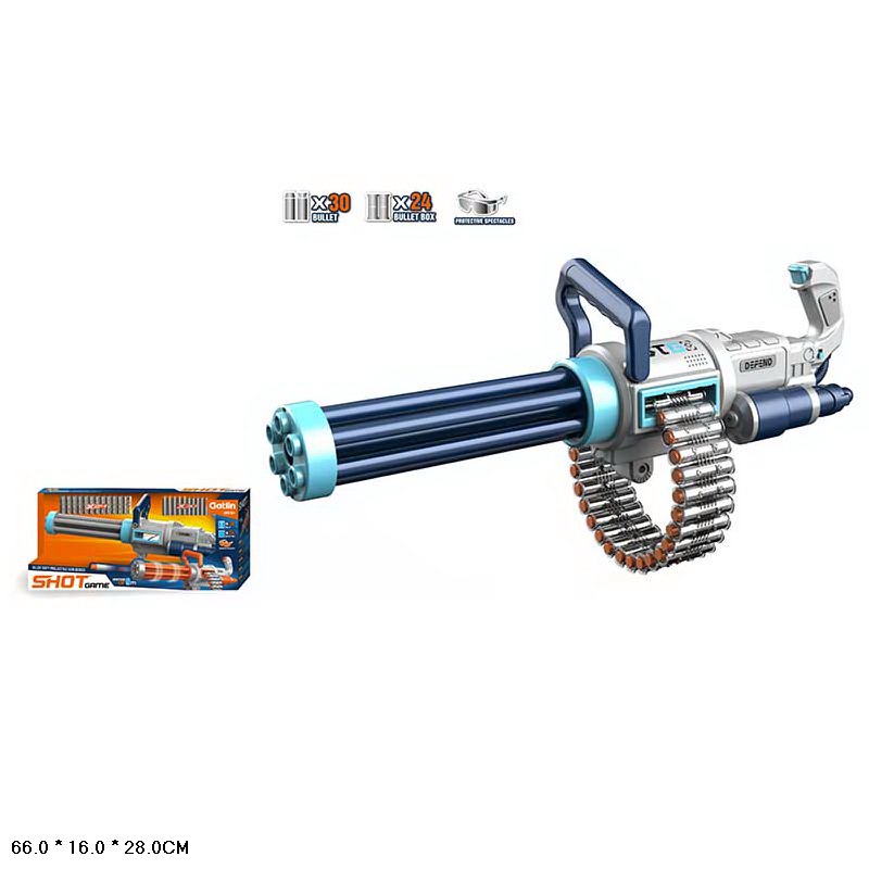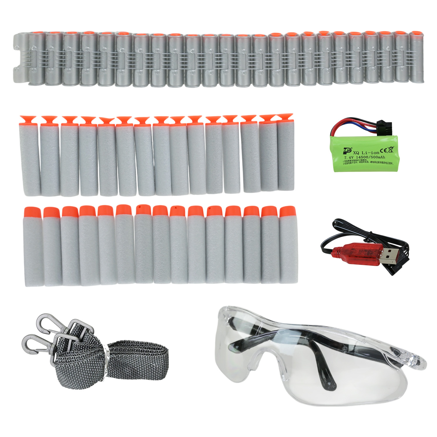 Комплектація: мініган, захисні окуляри, 30 поролонових боєприпасів, стрічка для снарядів (може вмістити до 24 куль), ремінці для зручності носіння зброї, акумулятор і зарядка для акумулятора.