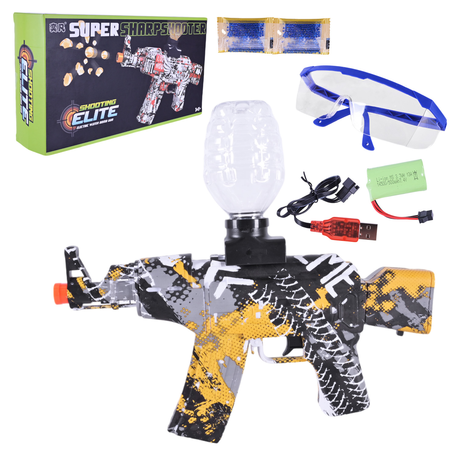 Автомат арт. YF1707 (36шт/2) батар. 4кольора, акум.,стріляє гел.кулями,аксесуари, короб.р-р iгр 31*28 см
