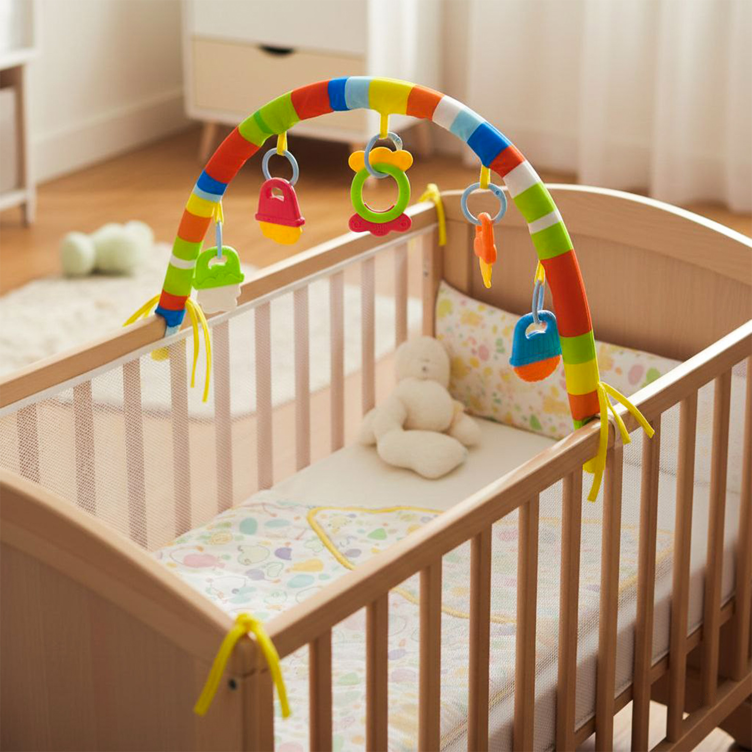 • Кругле кріплення легко фіксується на ліжечку чи візочку, тримає всі брязкальця на своєму місці.