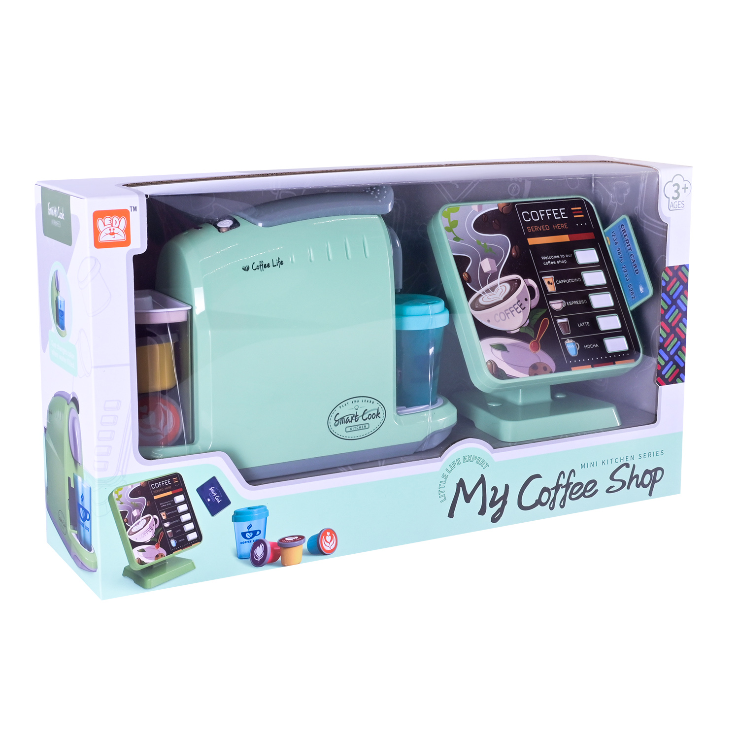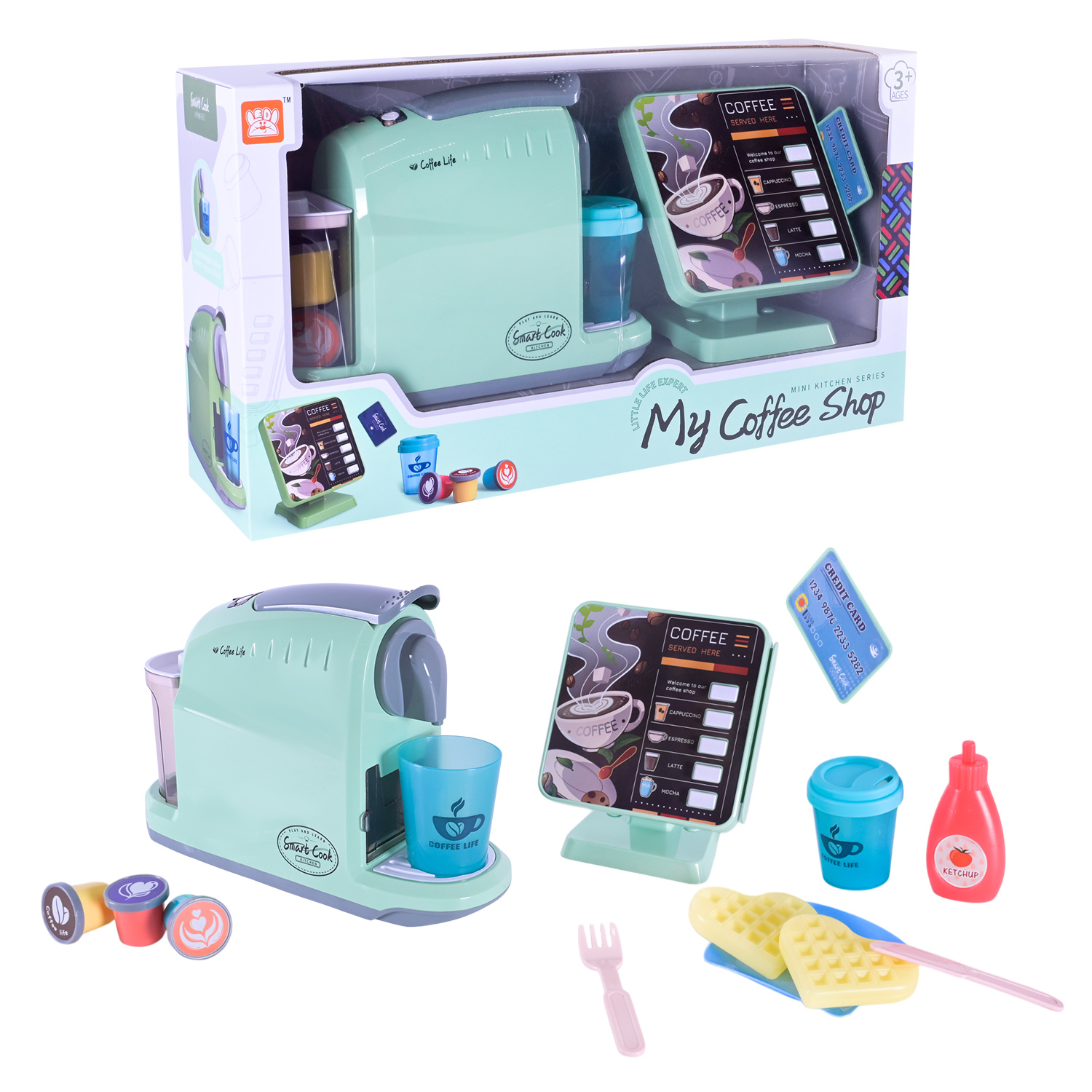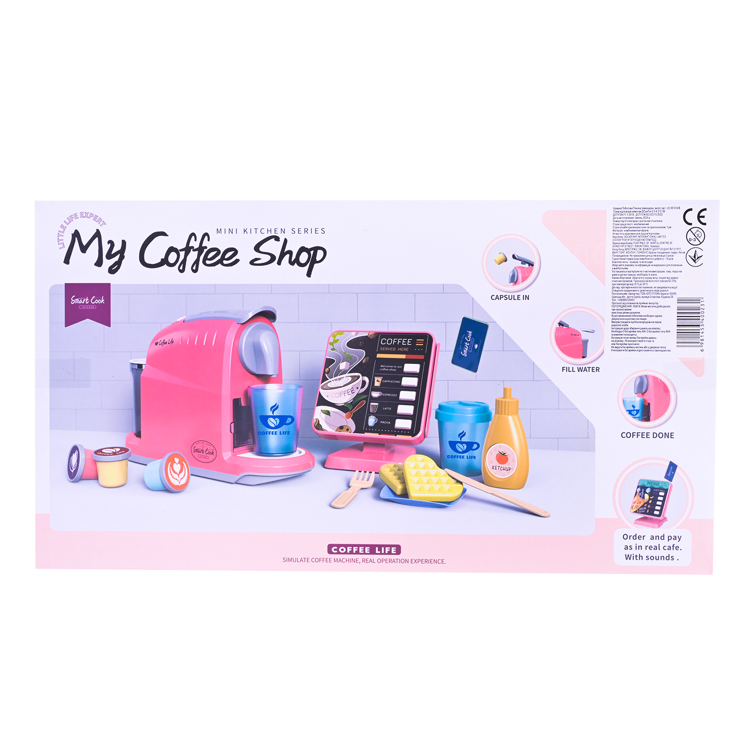 Комплектація: кавоварка, касовий апарат, іграшкові капсули з кавою, стаканчик з кришками, продукти,кредитна карта та столові прилади.