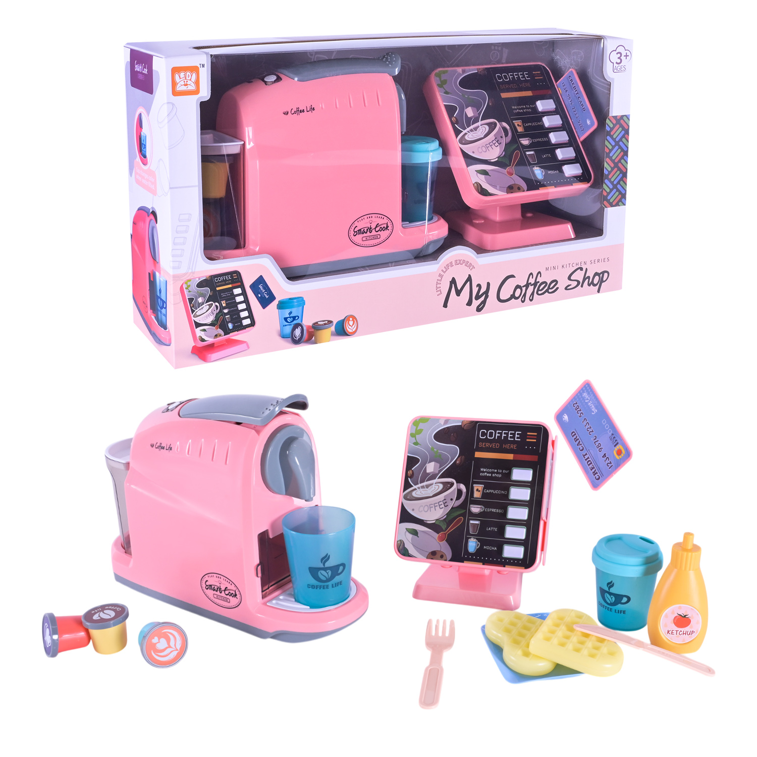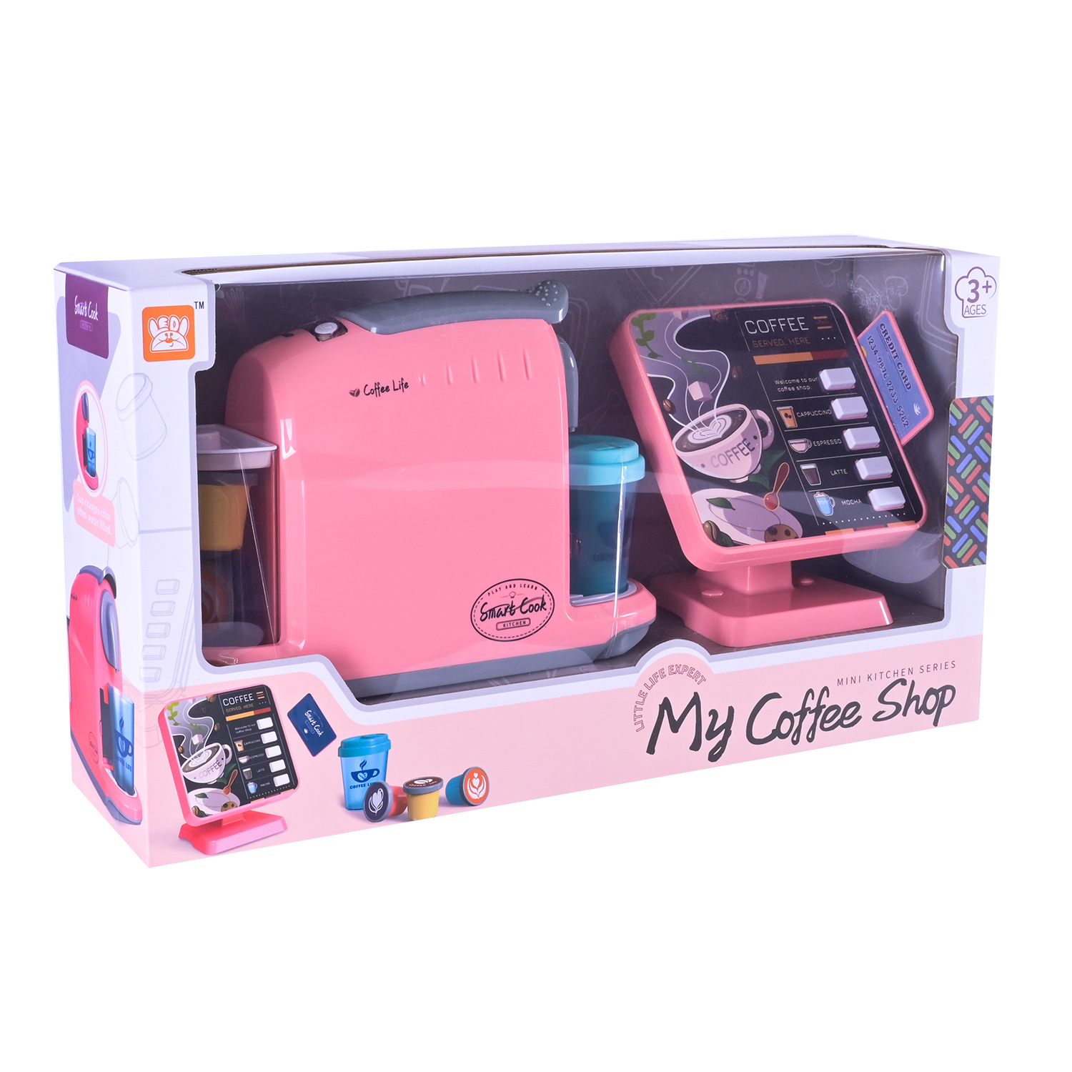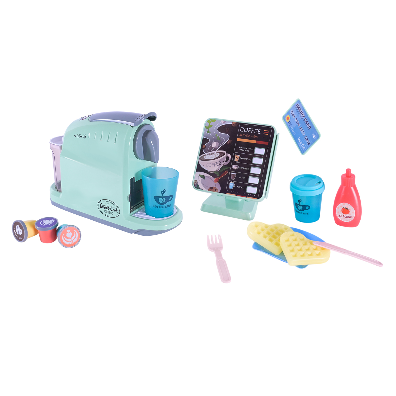 Комплектація: кавоварка, касовий апарат, іграшкові капсули з кавою, стаканчик з кришками, продукти,кредитна карта та столові прилади.