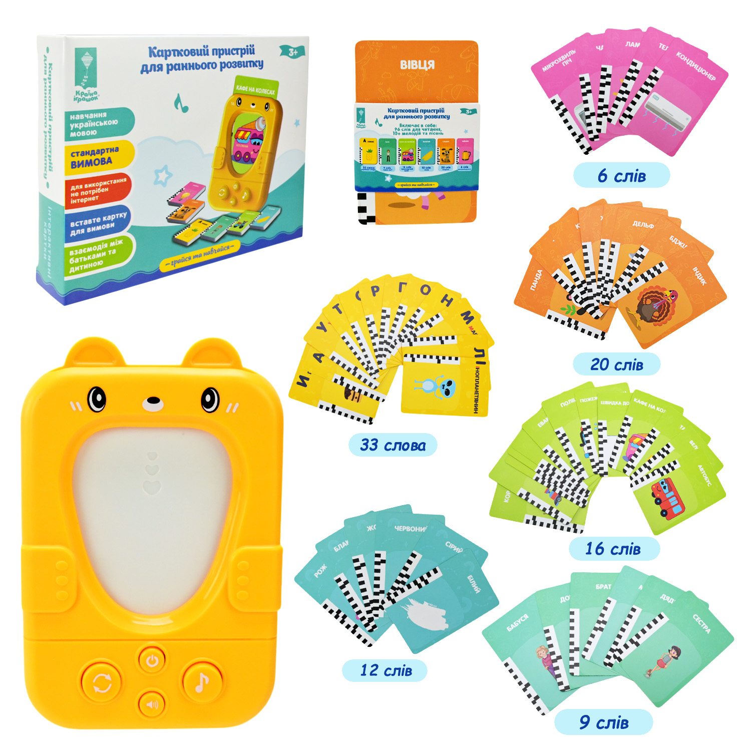 Представляємо вашій увазі новинку серед електронних пристроїв для раннього розвитку серії “Грайся та навчайся” від “Країни Іграшок”. Така іграшка допоможе малюку вивчати нові слова за допомогою карткового пристрою і карток зі словами до нього. Цей картковий пристрій зможе захопити увагу дитини на довгий час своєю багатофункціональністю. У дитини буде можливість познайомитись зі словами на різні теми: українська абетка, члени сім’ї, транспортні засоби, кольори, тварини, електрообладнання.