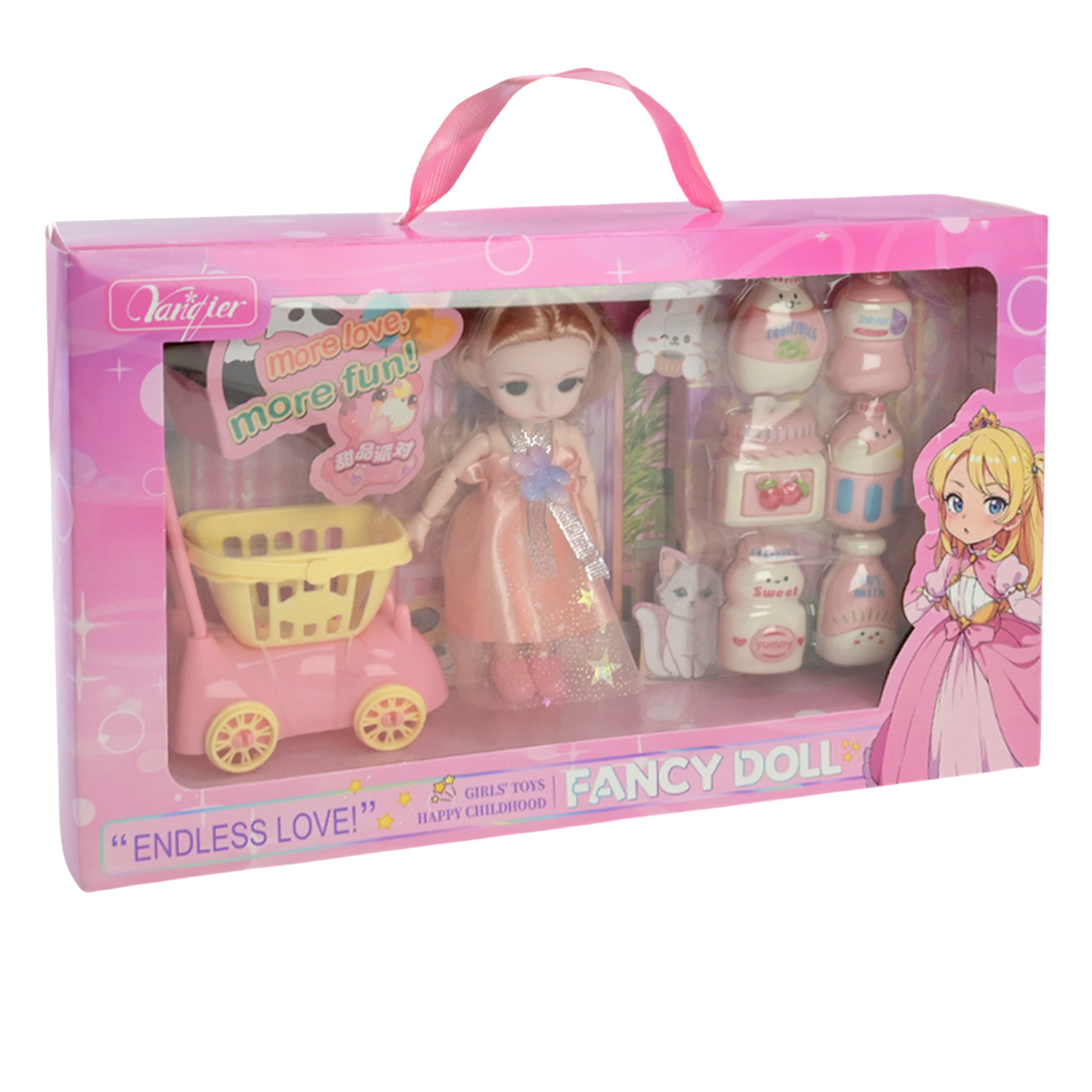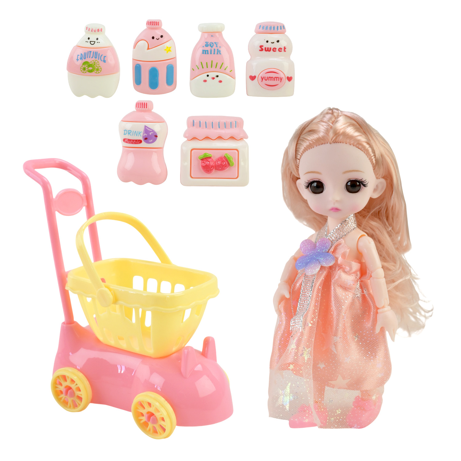 2) лялька, машинка-каталка з кошиком для покупок та набір різних продуктів.