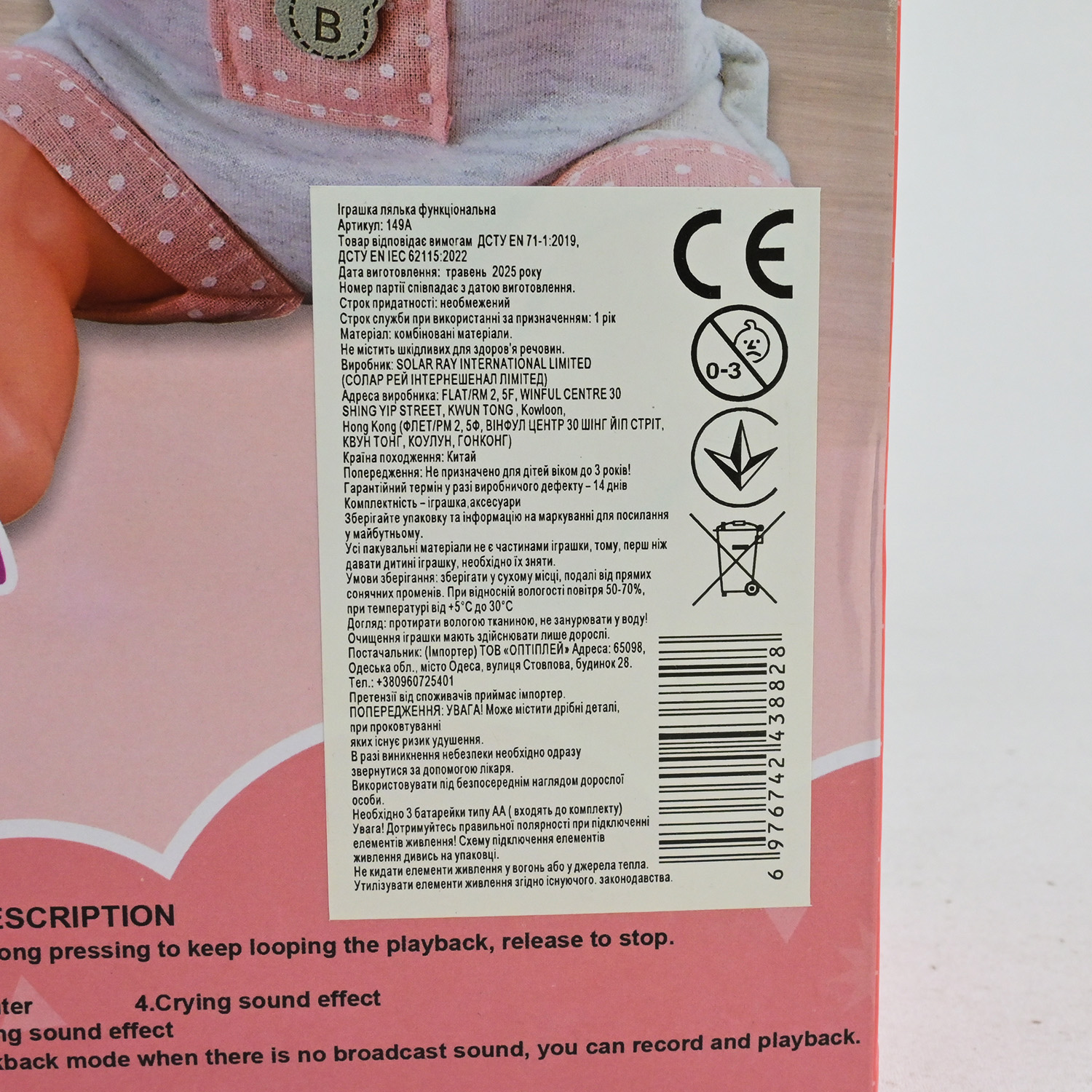 Лялька функціональна арт. 149A (36шт/2) батар. входять у комплект, повторює слова,мама, сміх, рух короб. 34*10*17