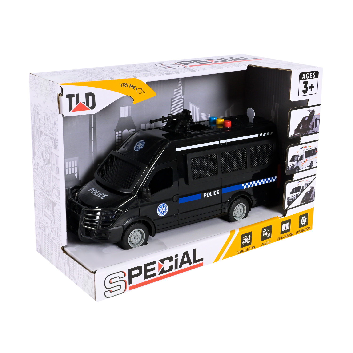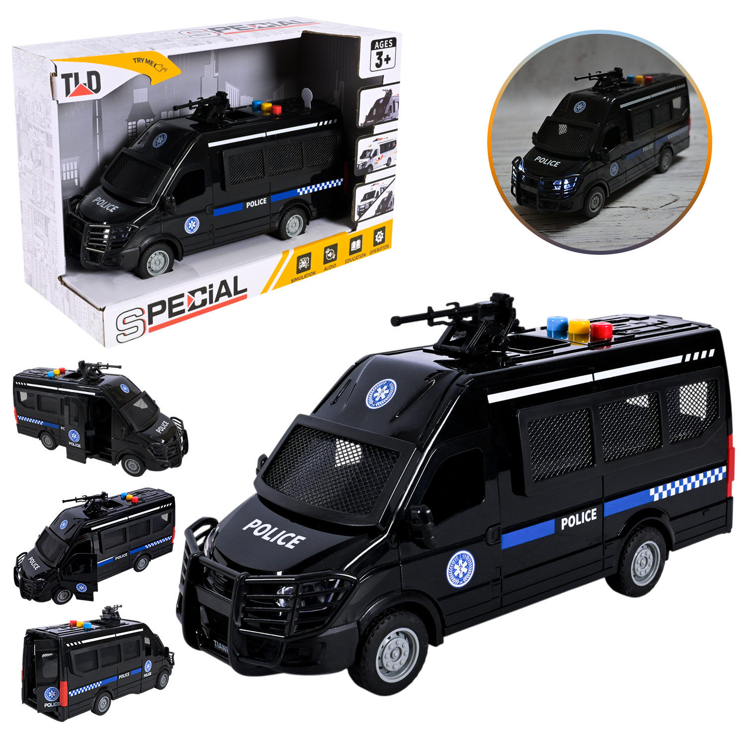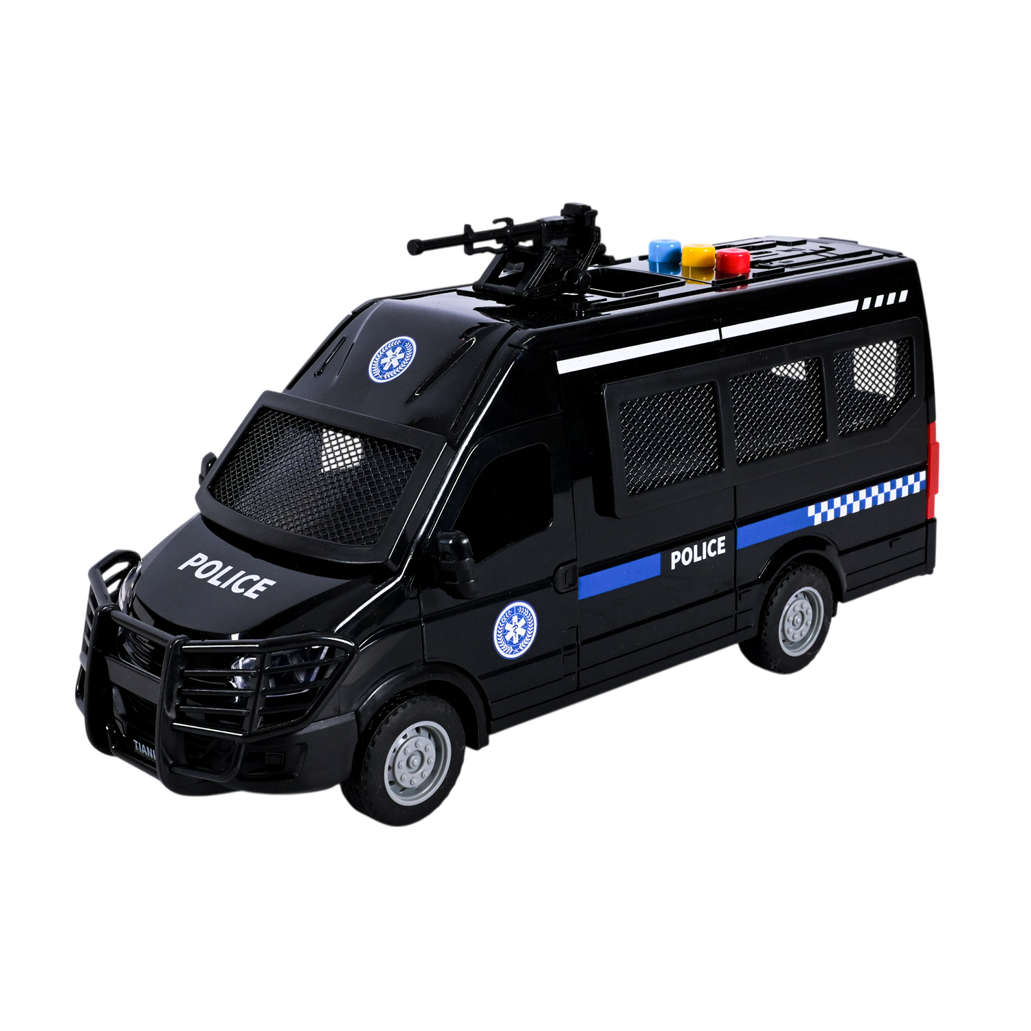 •Реалістичний дизайн: іграшка виконана у формі поліцейського мікроавтобуса з сітками на вікнах — як у справжнього транспорту спецпризначення.