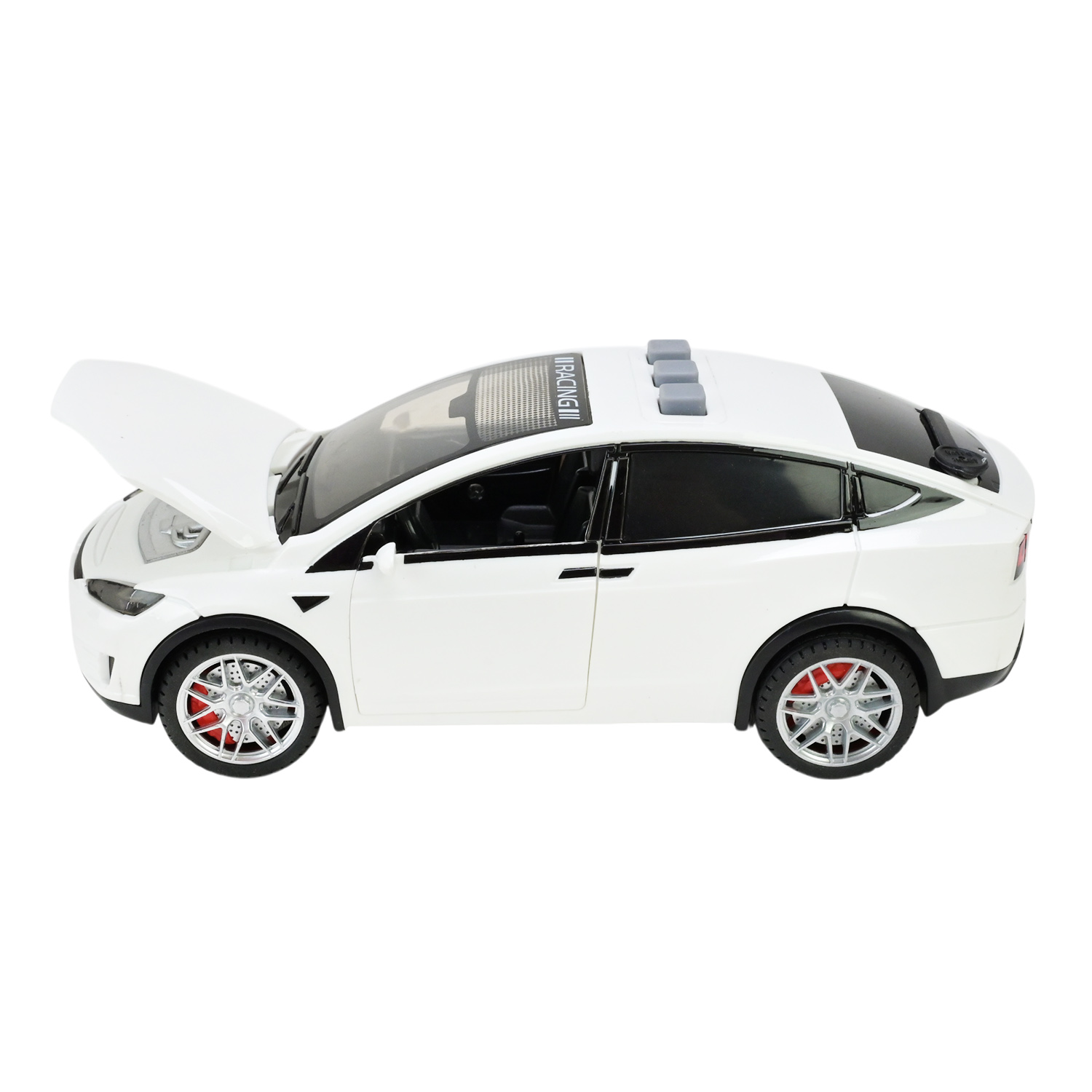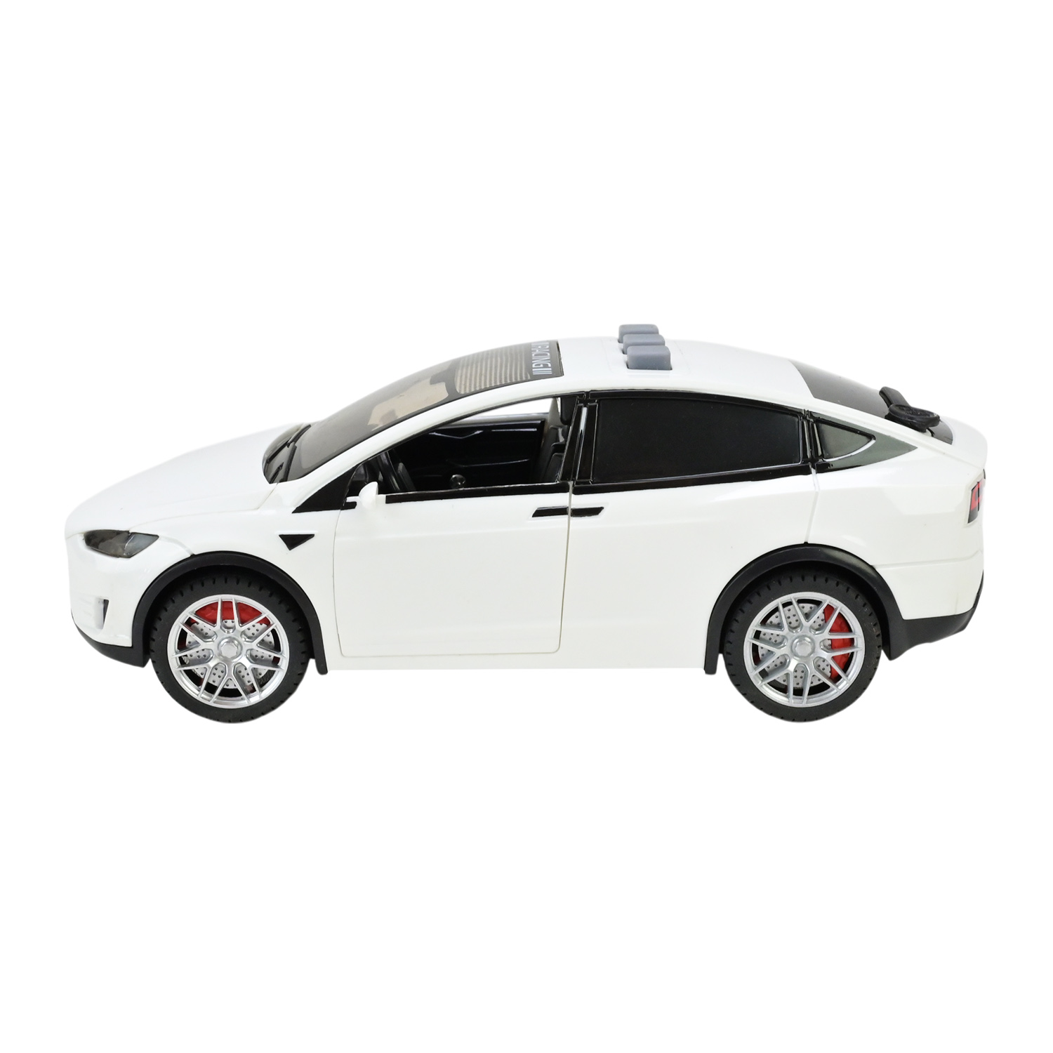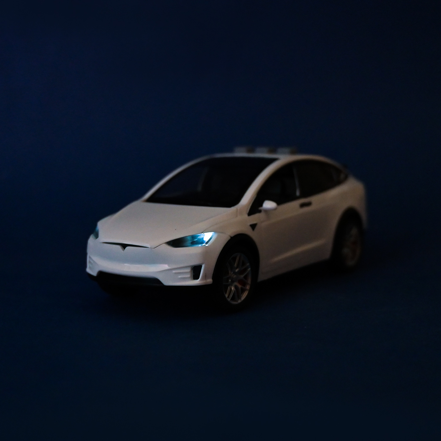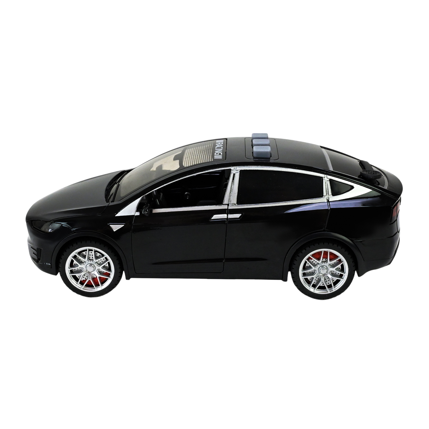 • Дизайн у стилі Tesla — іграшковий автомобіль виконано в сучасному, впізнаваному стилі Tesla з плавними лініями, футуристичними елементами та деталями, що нагадують справжній електрокар.