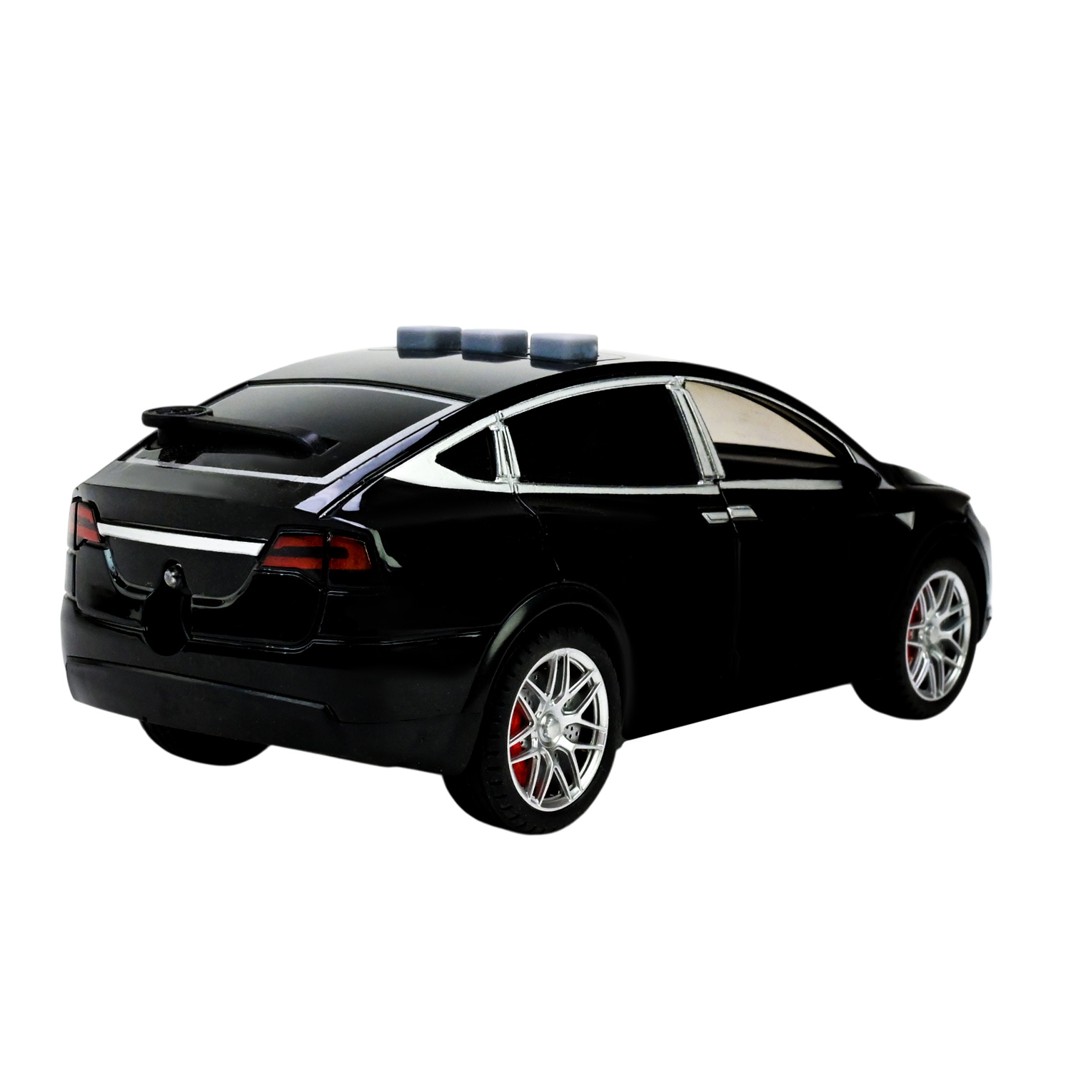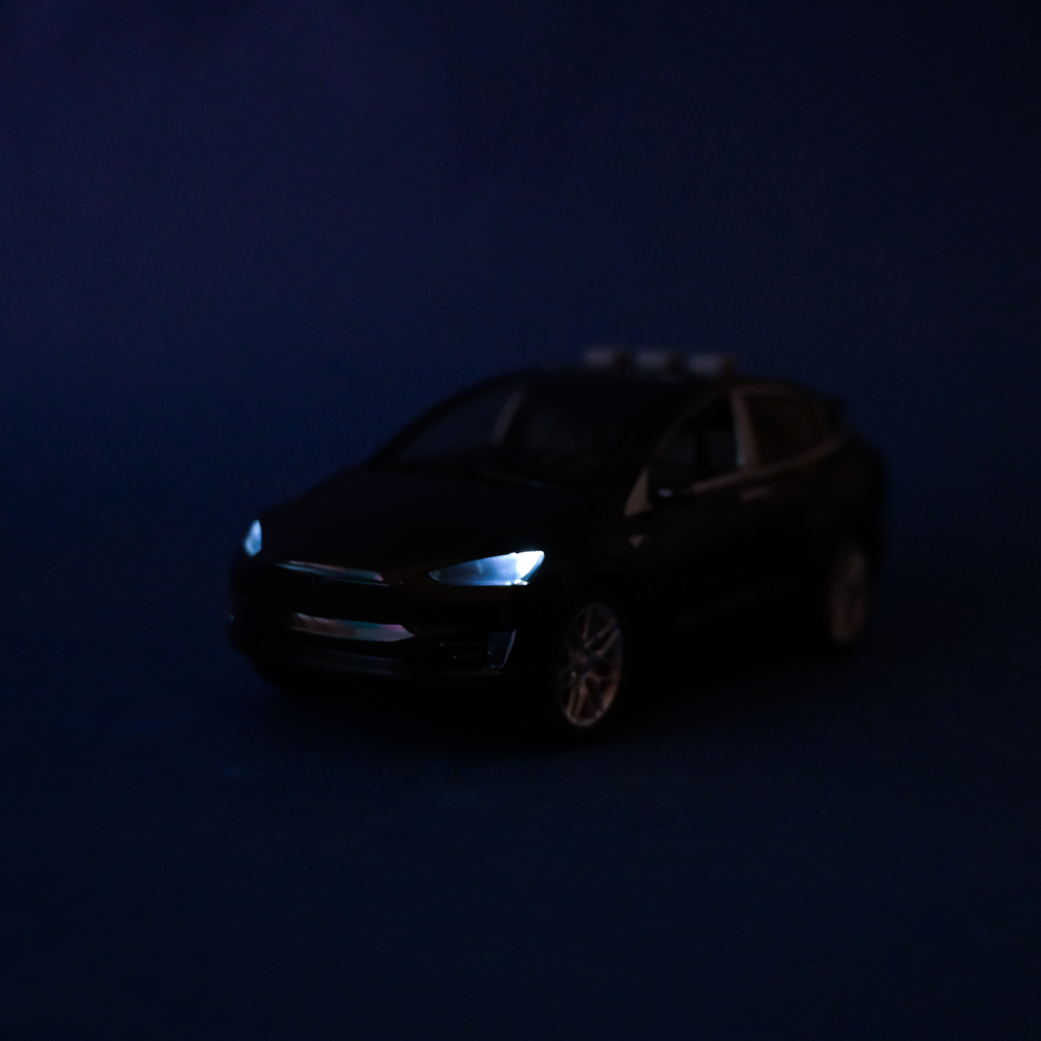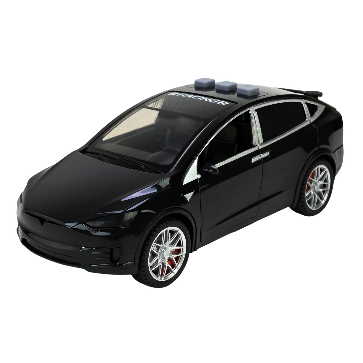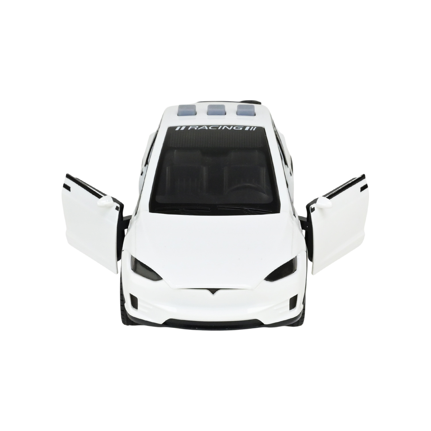 • Дизайн у стилі Tesla — іграшковий автомобіль виконано в сучасному, впізнаваному стилі Tesla з плавними лініями, футуристичними елементами та деталями, що нагадують справжній електрокар.