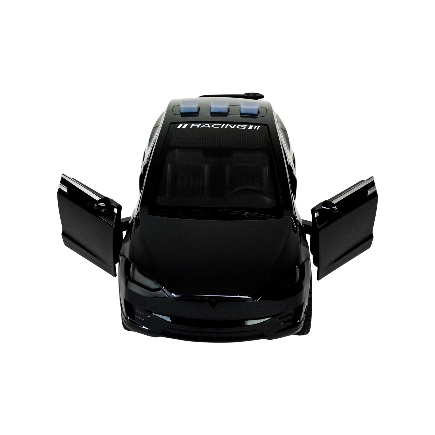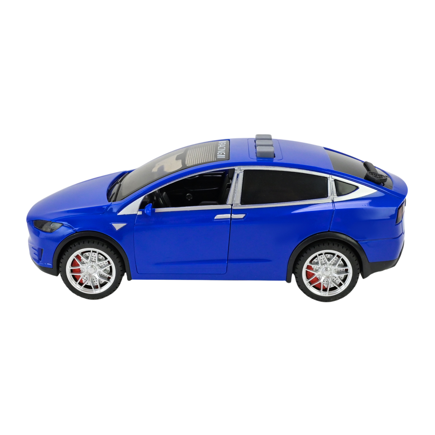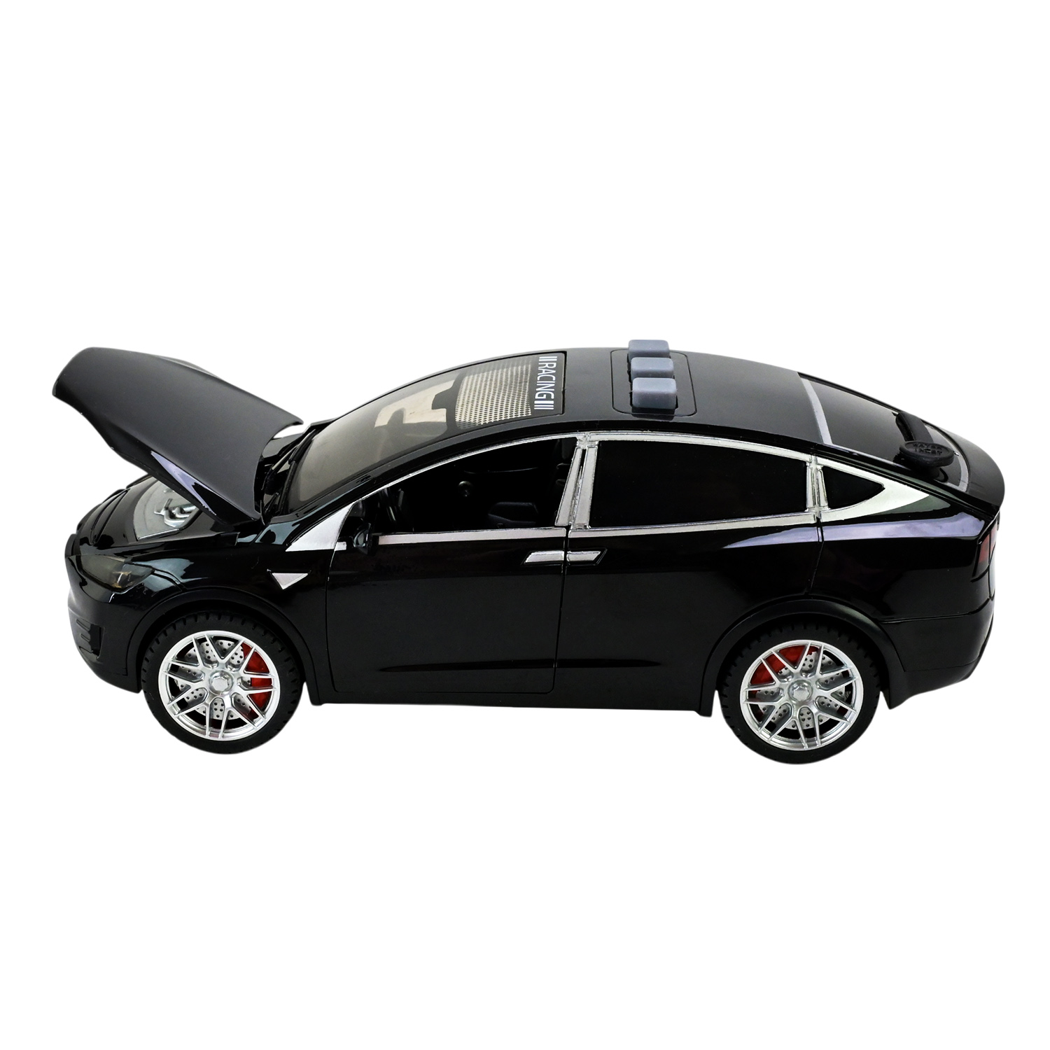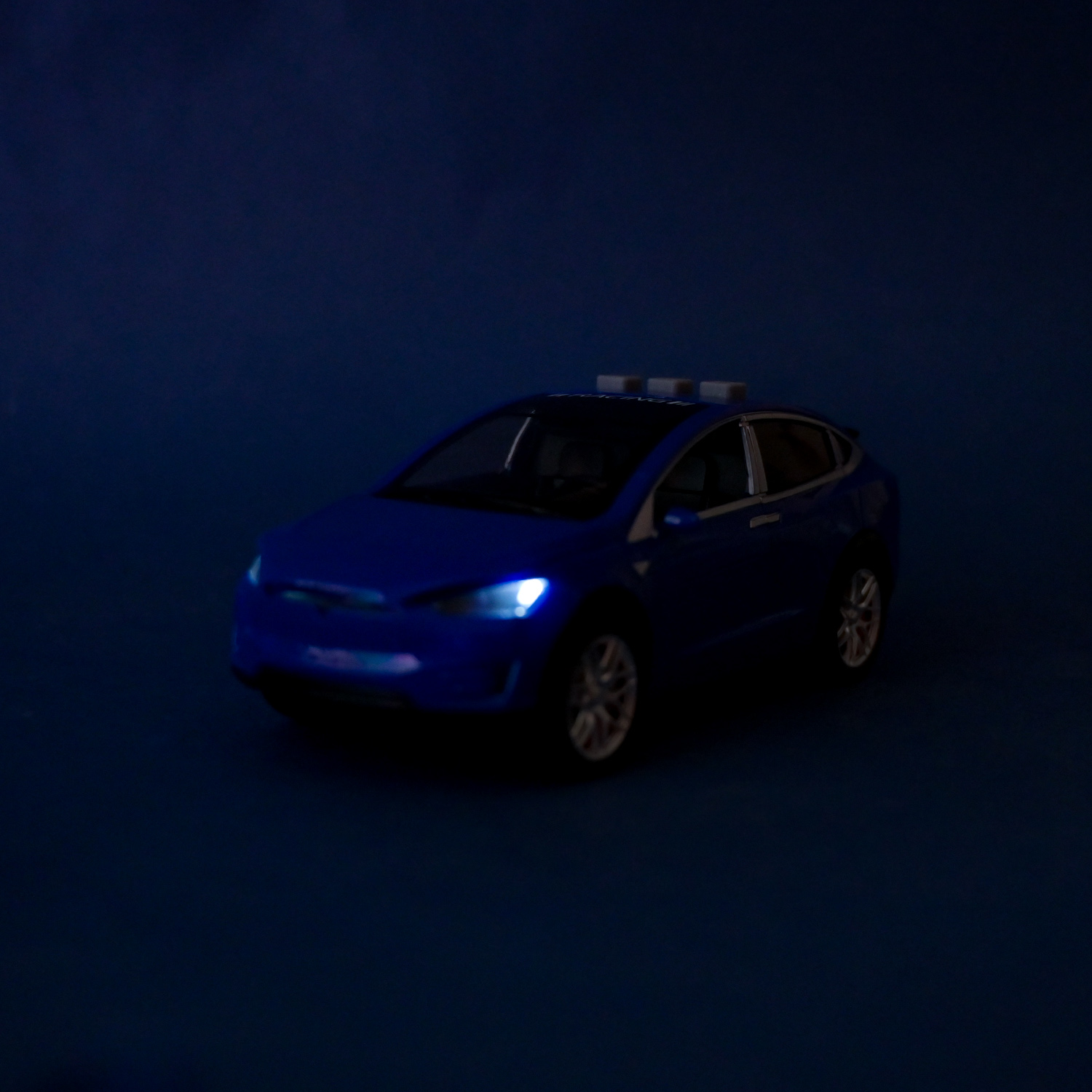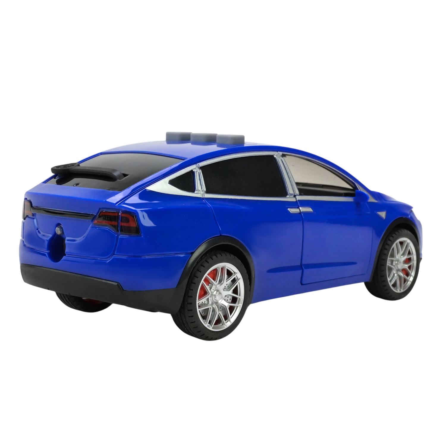 • Дизайн у стилі Tesla — іграшковий автомобіль виконано в сучасному, впізнаваному стилі Tesla з плавними лініями, футуристичними елементами та деталями, що нагадують справжній електрокар.