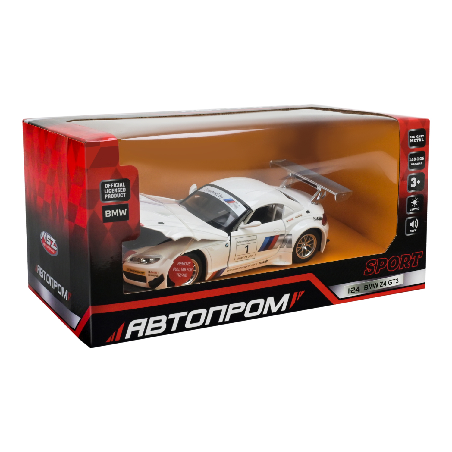Машина мет. АВТОПРОМ арт. 68260A (12шт/2) 1:24 “BMW Z4 GT3”, батар., світло, звук, відкр.двері, капіт, короб. 24,5 * 12 * 10см