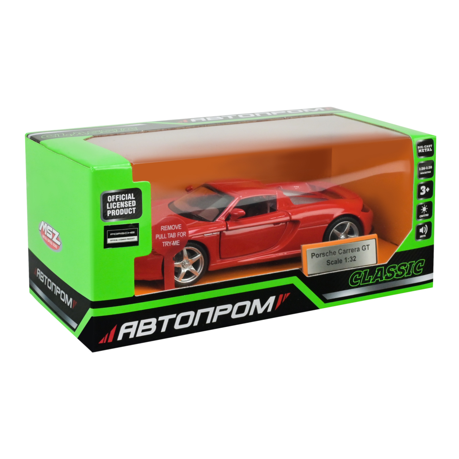 Машина мет. АВТОПРОМ арт. 68343 (48шт/2),1:32 Porsche Carrera GT ,батар, світ.,звук,відкр..двері, короб. 18*9*9см