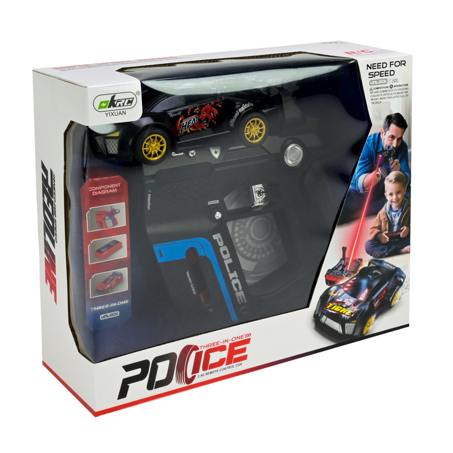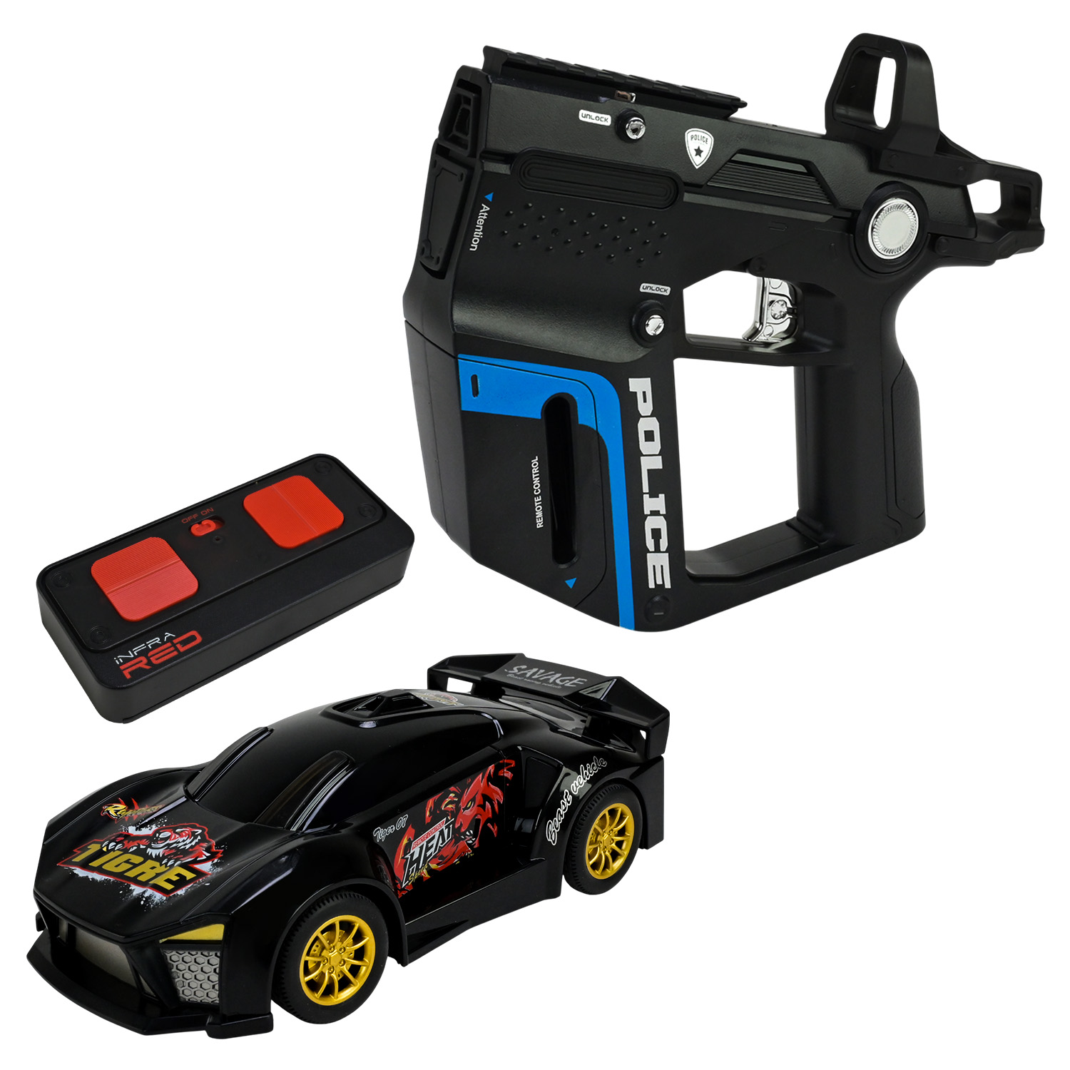 • Комплект поєднує швидкісну машинку, футуристичний інфрачервоний пістолет і пульт керування, виконані у вражаючому поліцейському дизайні.