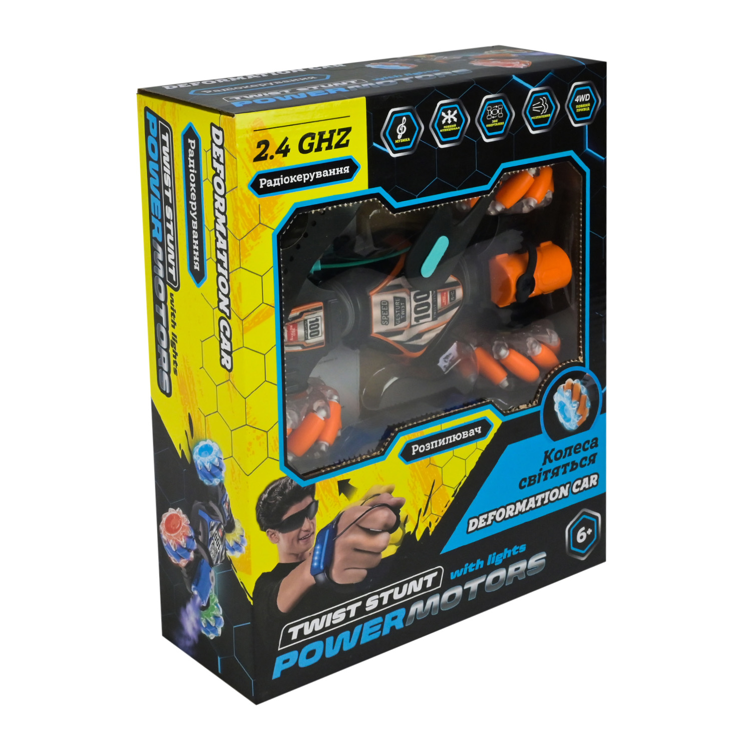 • Унікальна трансформація: за допомогою одного натискання кнопки на пульті керування вона миттєво змінює форму, перетворююсь з низької гоночної машинки у монстр-трак, щоб зручно долати будь-які перешкоди.