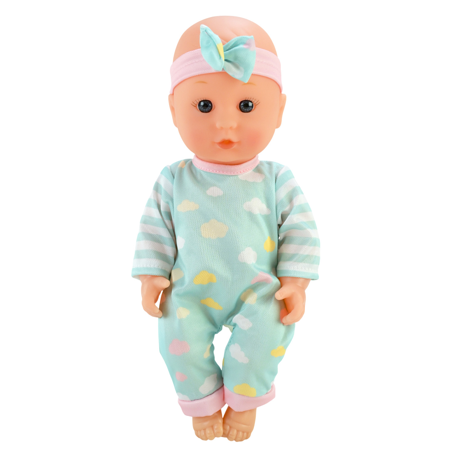 • Пупс має чарівний вигляд, одягнений у милий комбінезон із бантиком на голові, який доповнює образ.