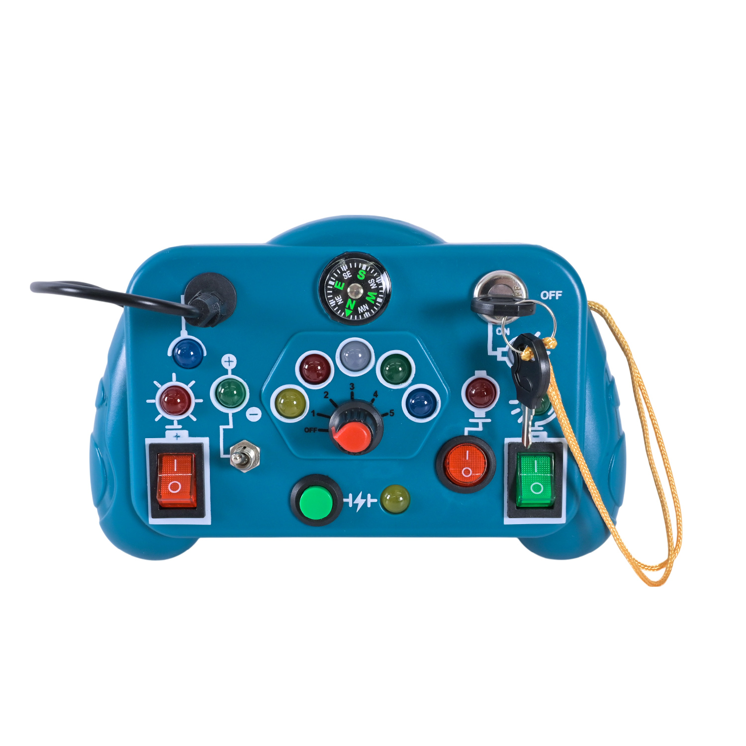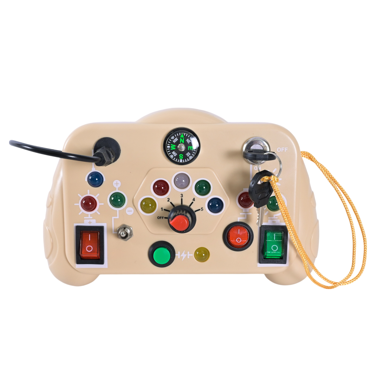 • Функціональні елементи: тумблери, кнопки, поворотний регулятор, замок запалювання, штекери — усе, що нагадує справжні прилади у дорослому світі.