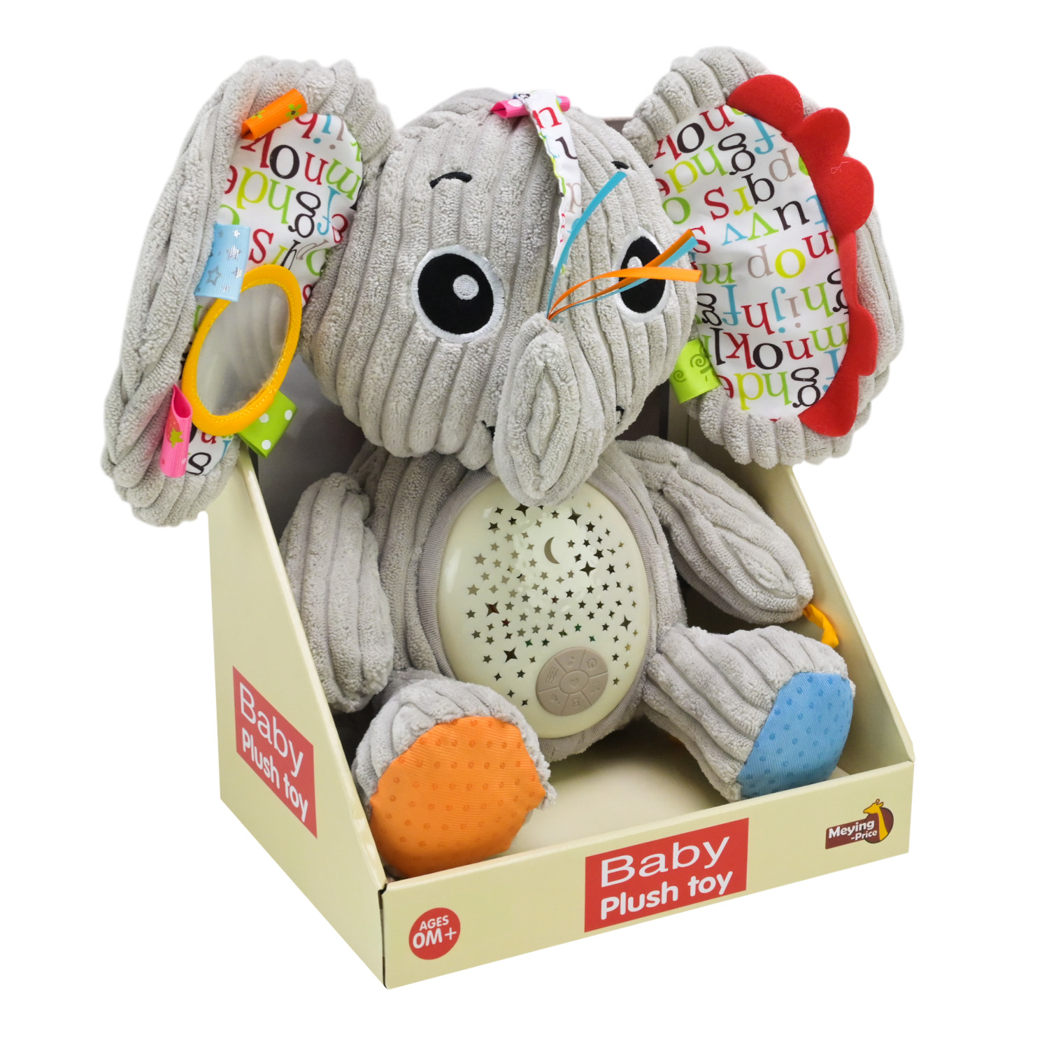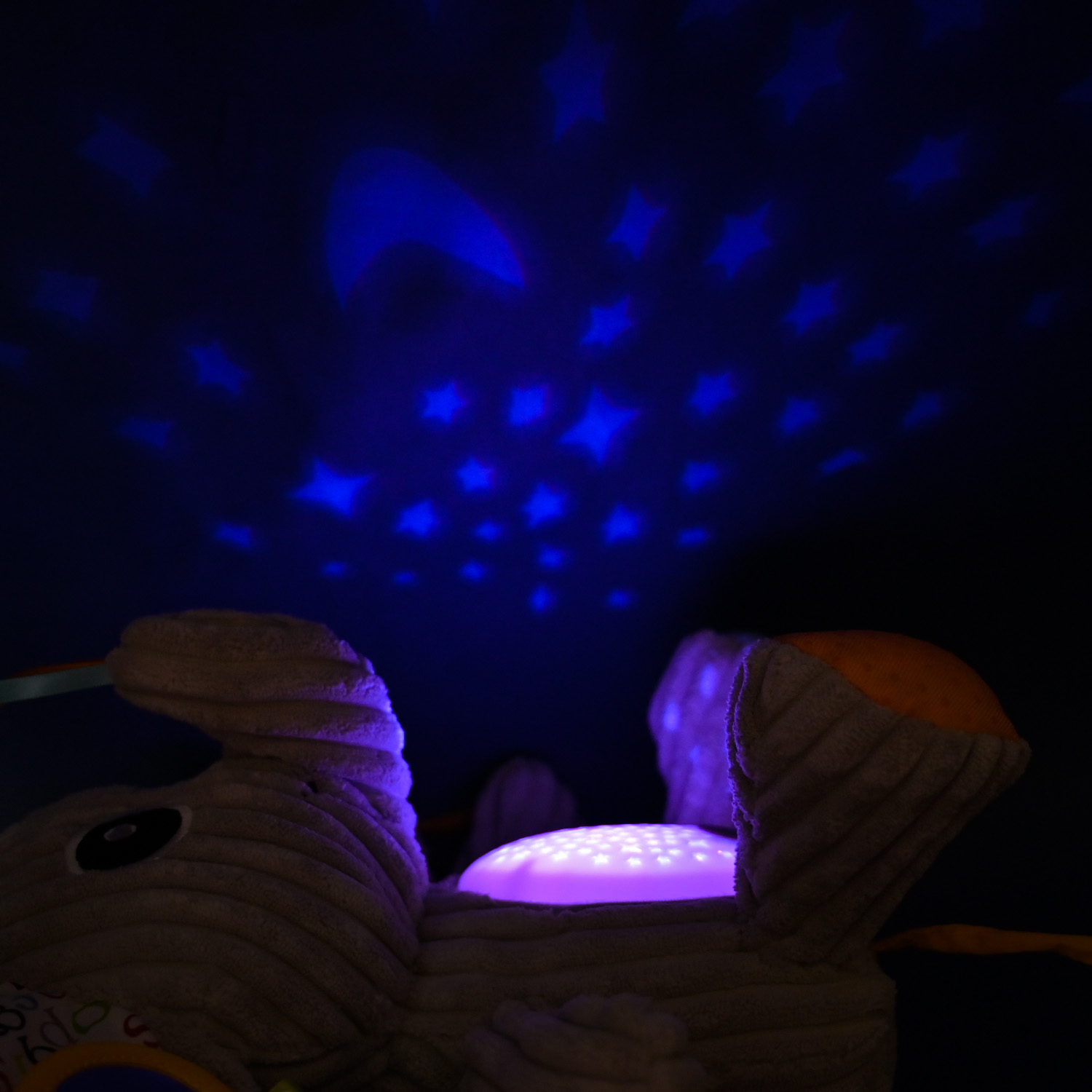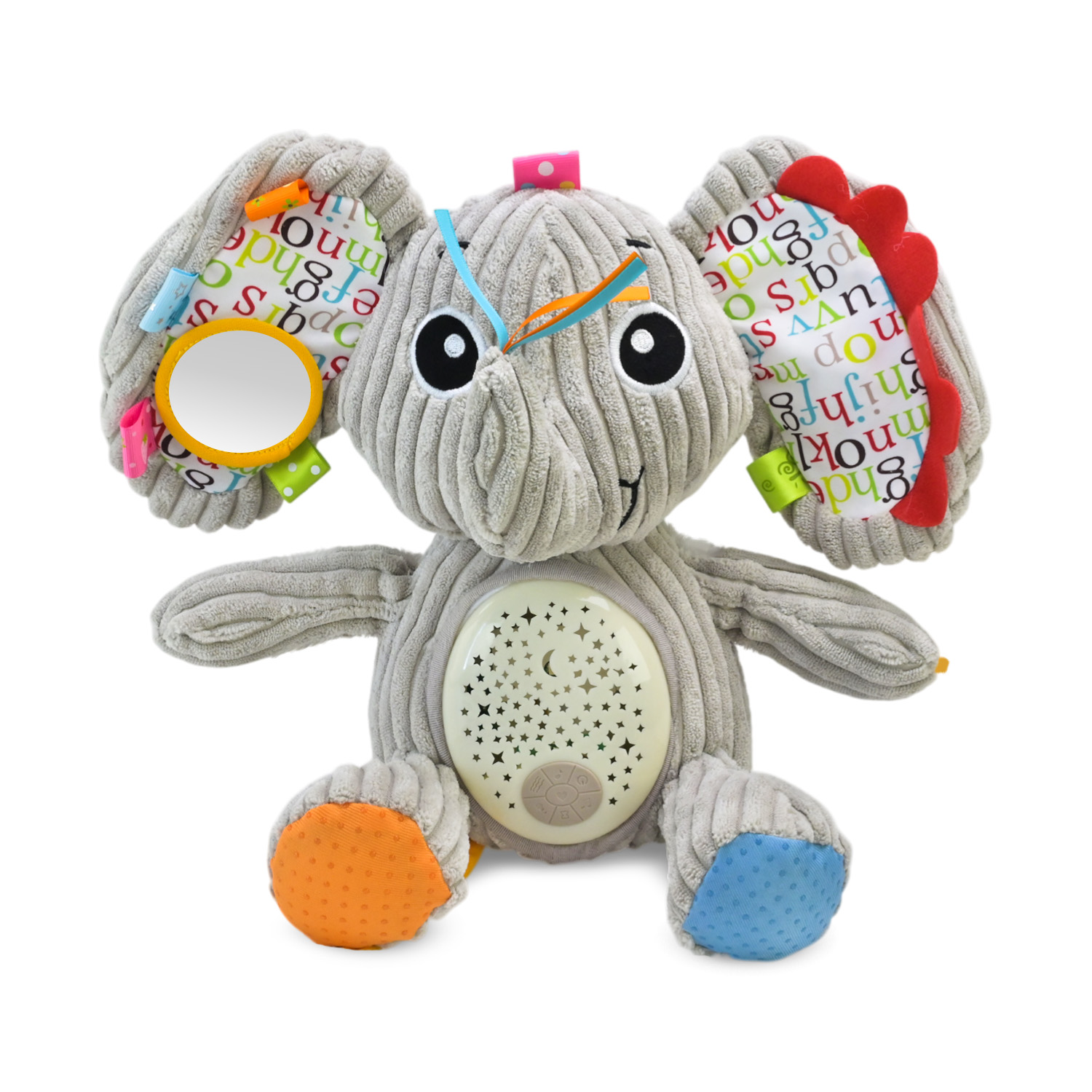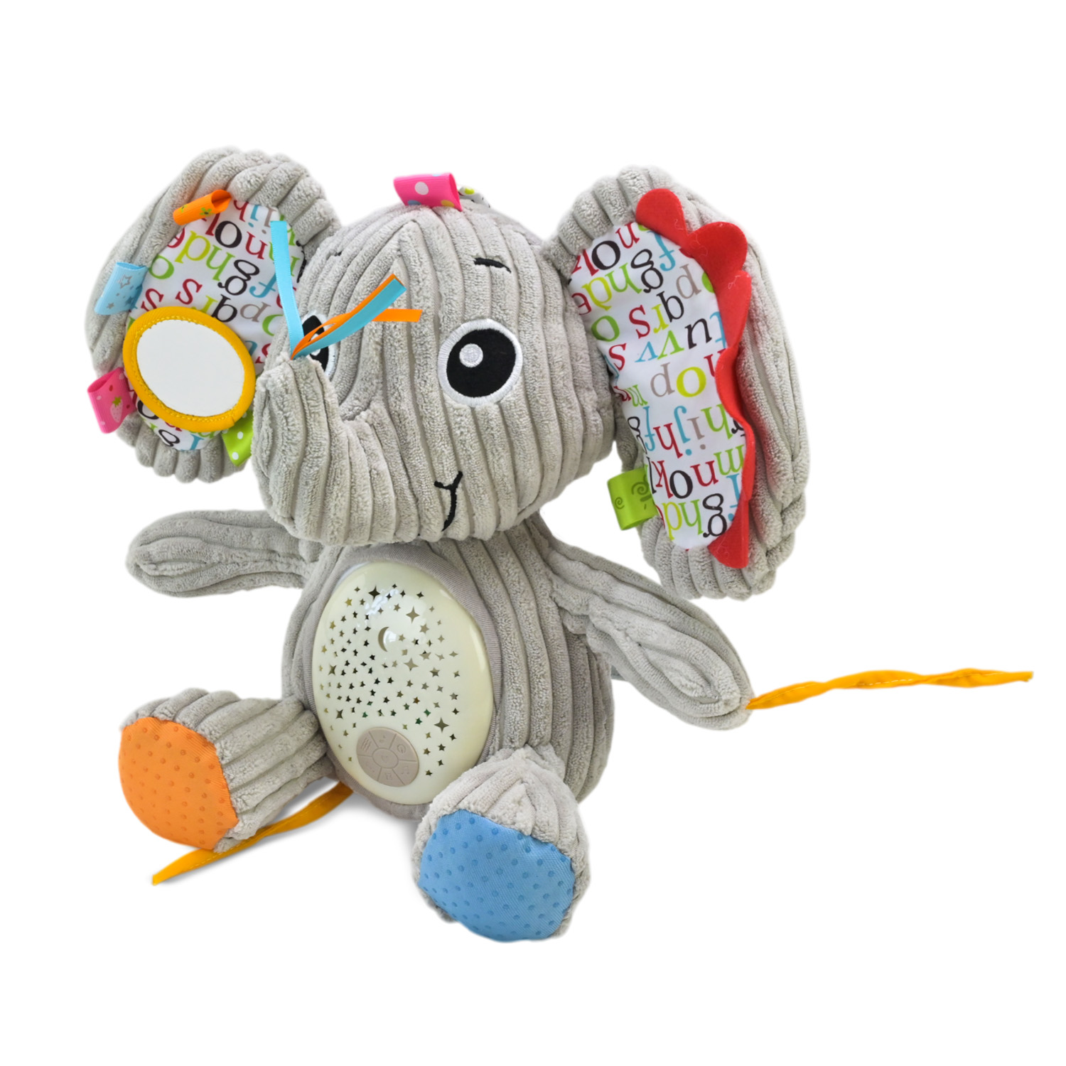 • Проектор зоряного неба — на животі слоника розташований проектор, який створює світлове шоу із зірочок на стелі та стінах, допомагаючи дитині заспокоїтись та легко заснути.