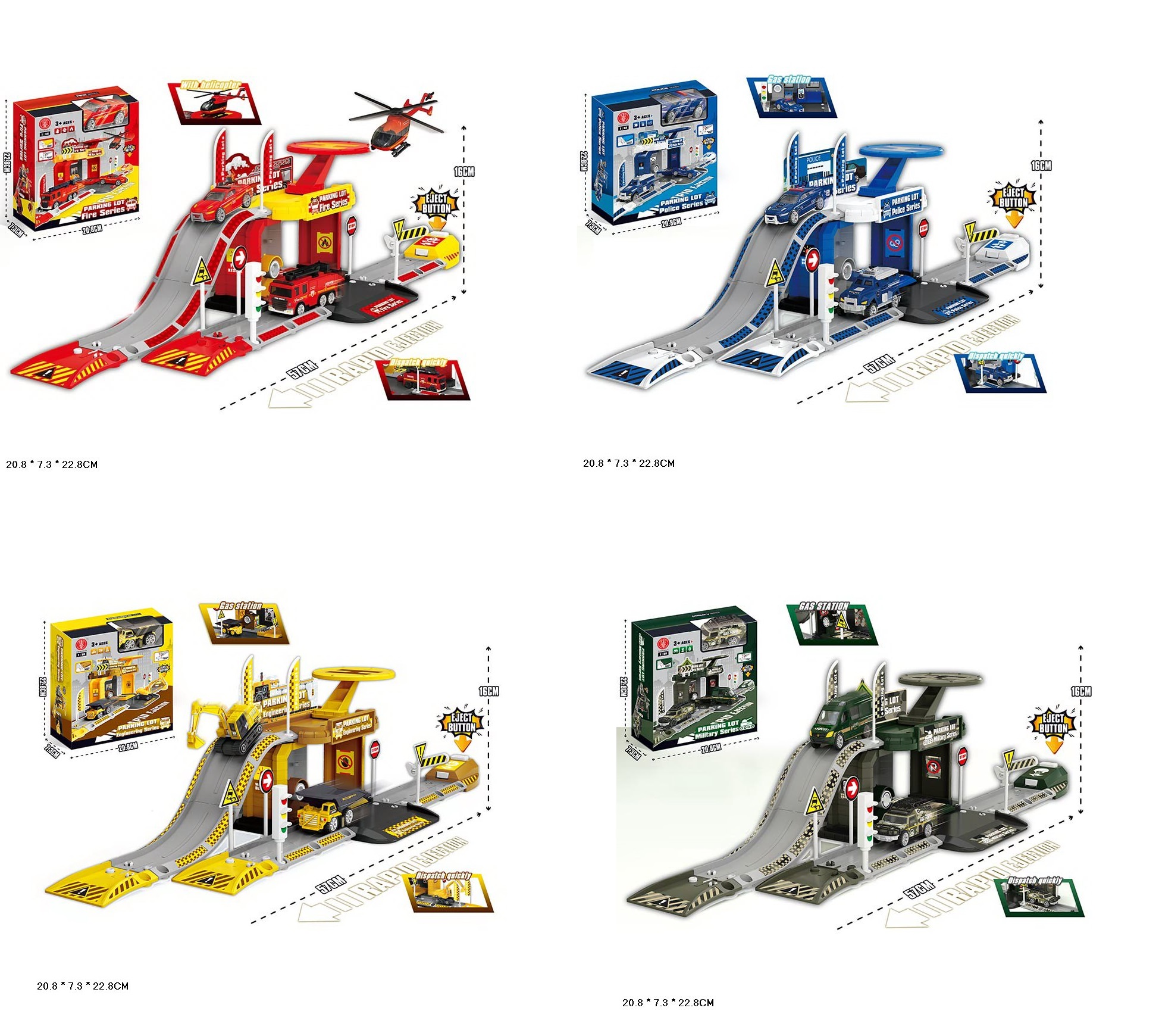 • Чотири тематичні дизайни: поліцейський, пожежний, будівельний, військовий — для різноманітності ігор.