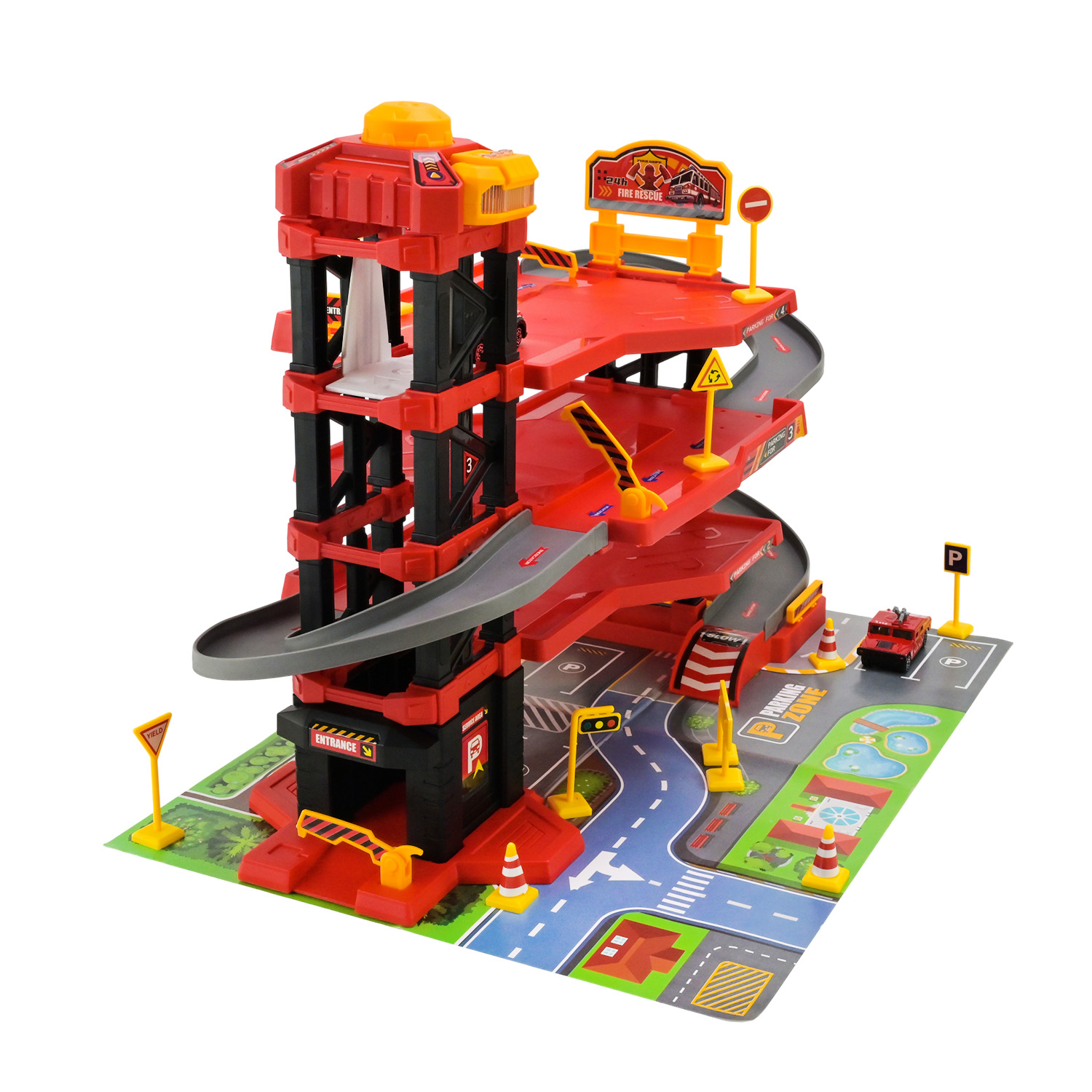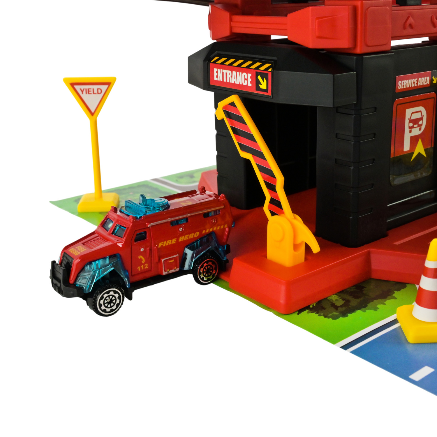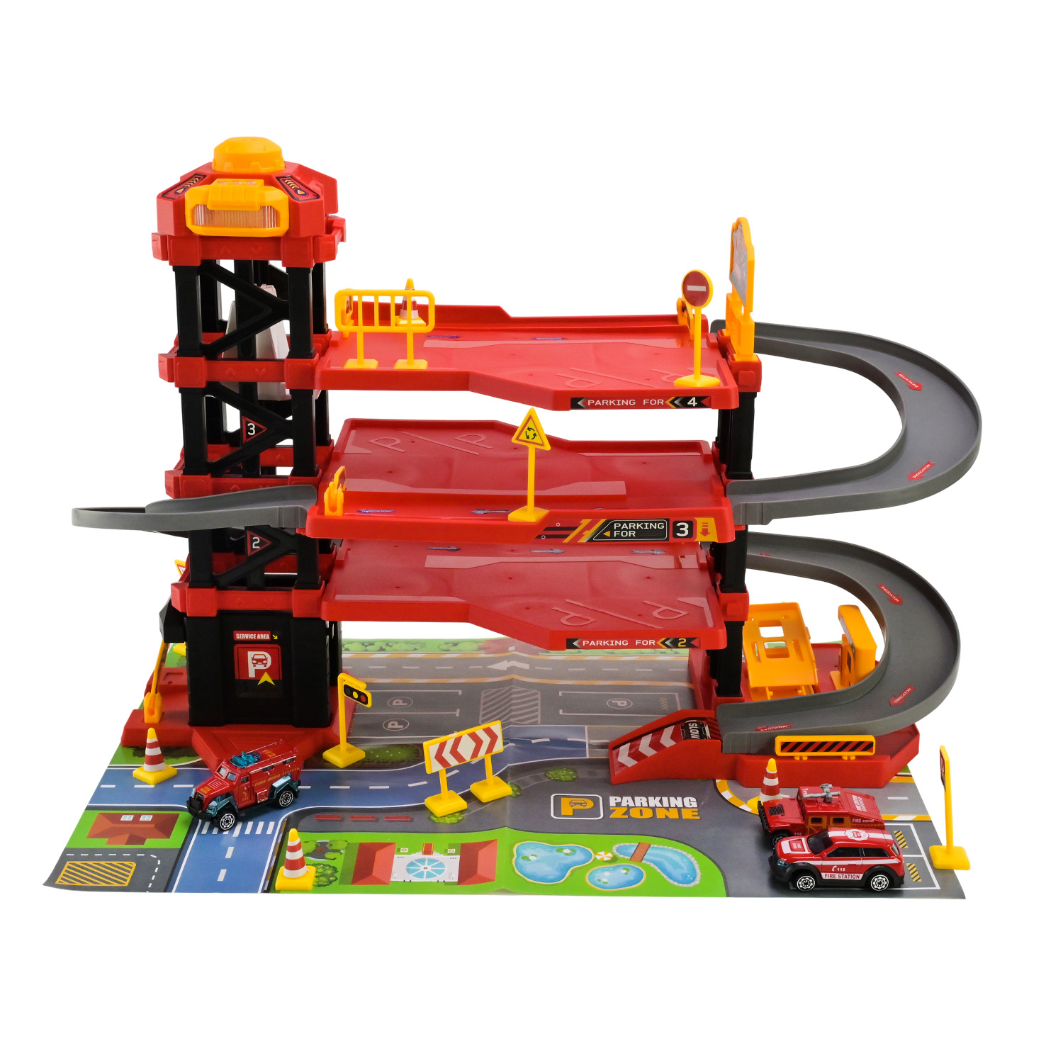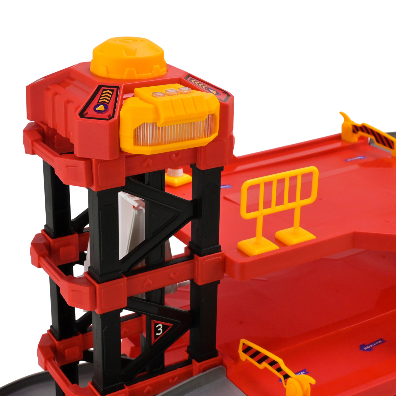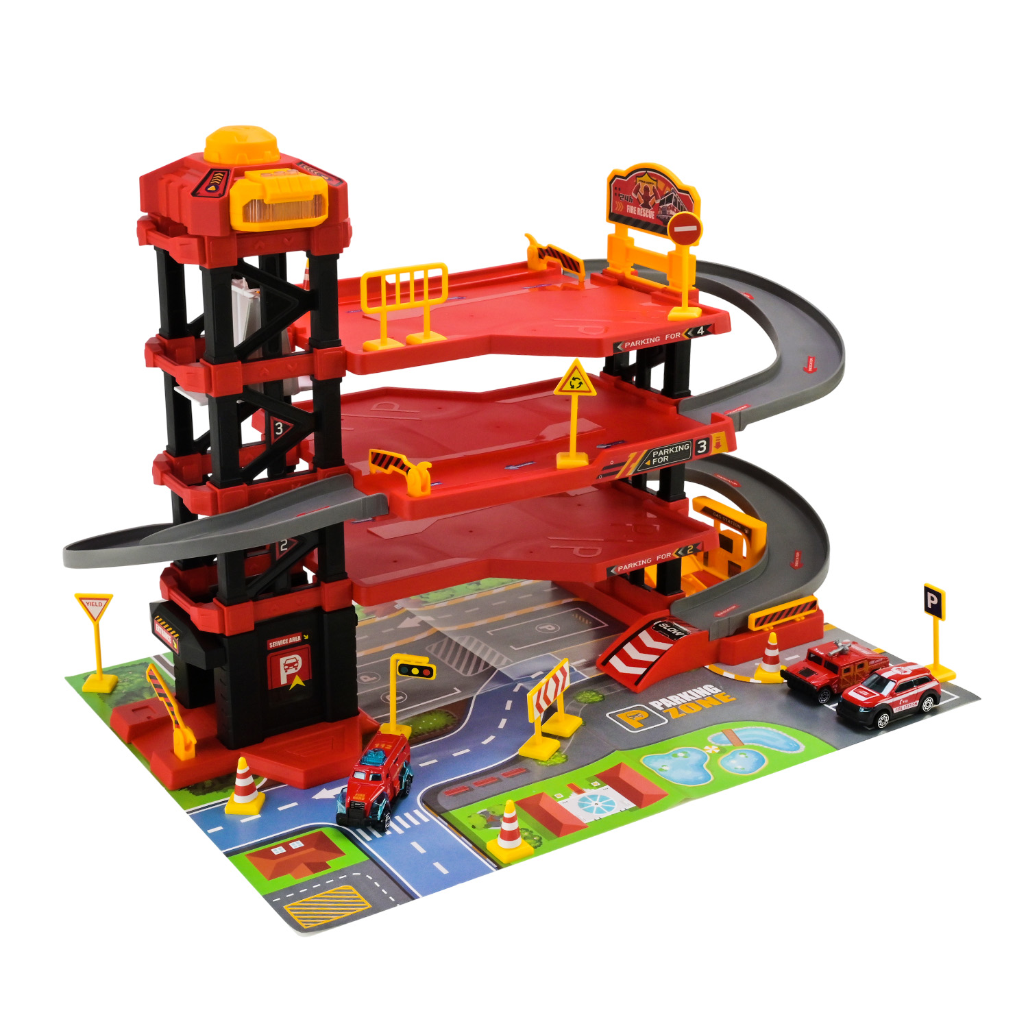 • Паркінг має звукові та світлові ефекти, які вмикаються завдяки кнопкам на вежі, створюючи атмосферу справжнього рятувальної служби.