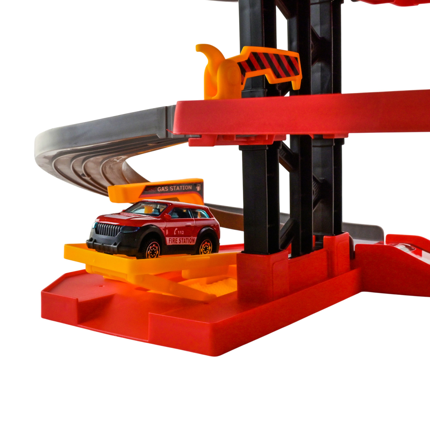 • Механічний підйомник для машинок — піднімає на верхні рівні та по серпантиновій дорозі вони весело мчать знов донизу, створюючи безперервний рух по колу.