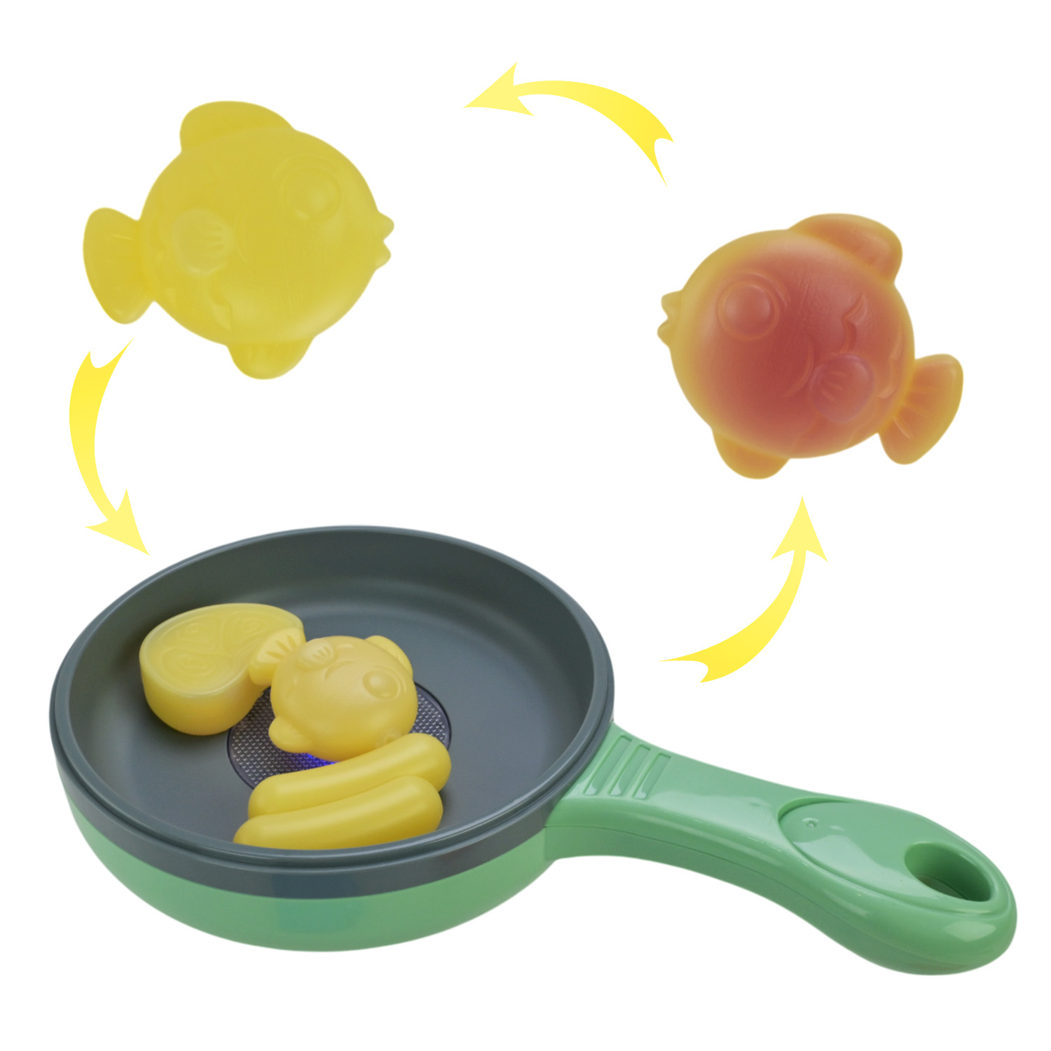 •іграшкові продукти з набору змінюють свій колір від “приготування” під світлом іграшки.