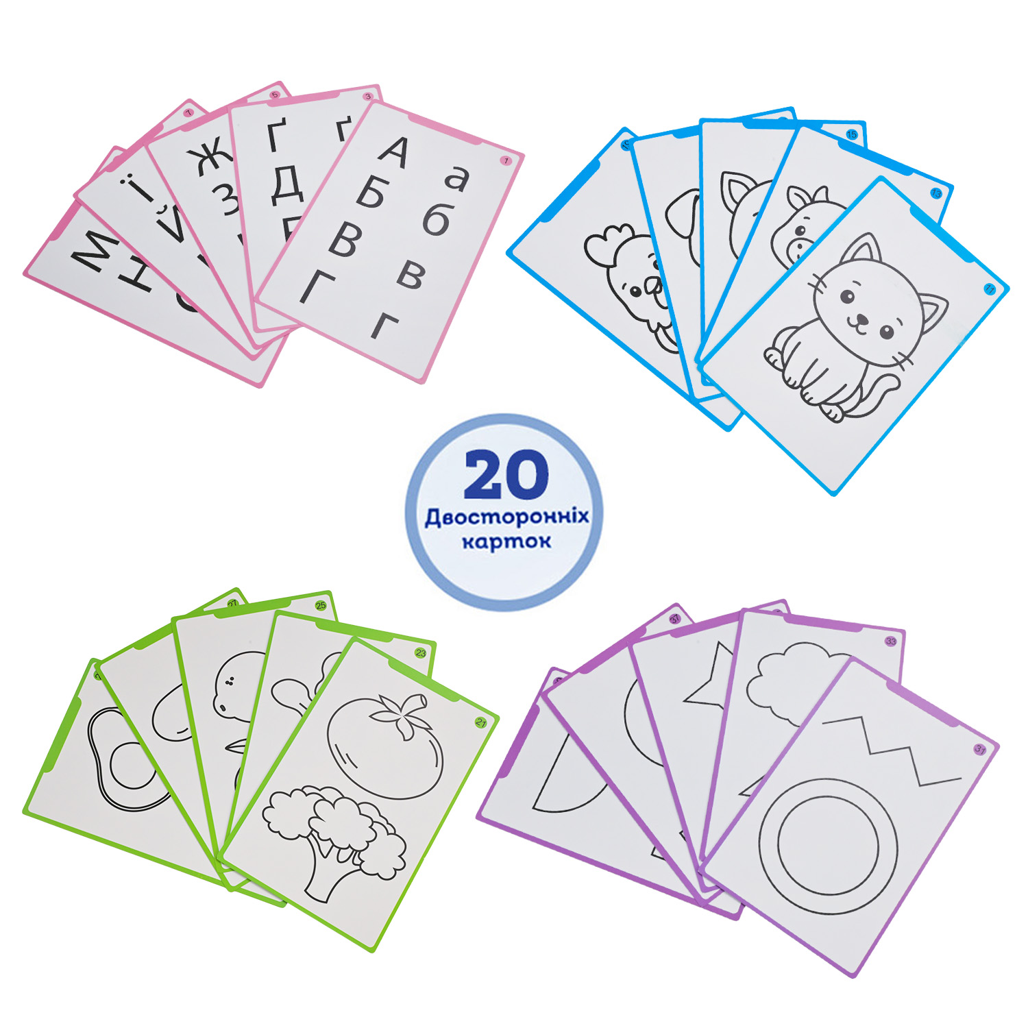 • У комплект входить 20 двосторонніх карток, які можна підкладати під прозорий екран, — вони допомагають дитині тренувати письмо, малювання, повторювати фігури, візерунки, а також вивчати українські літери.