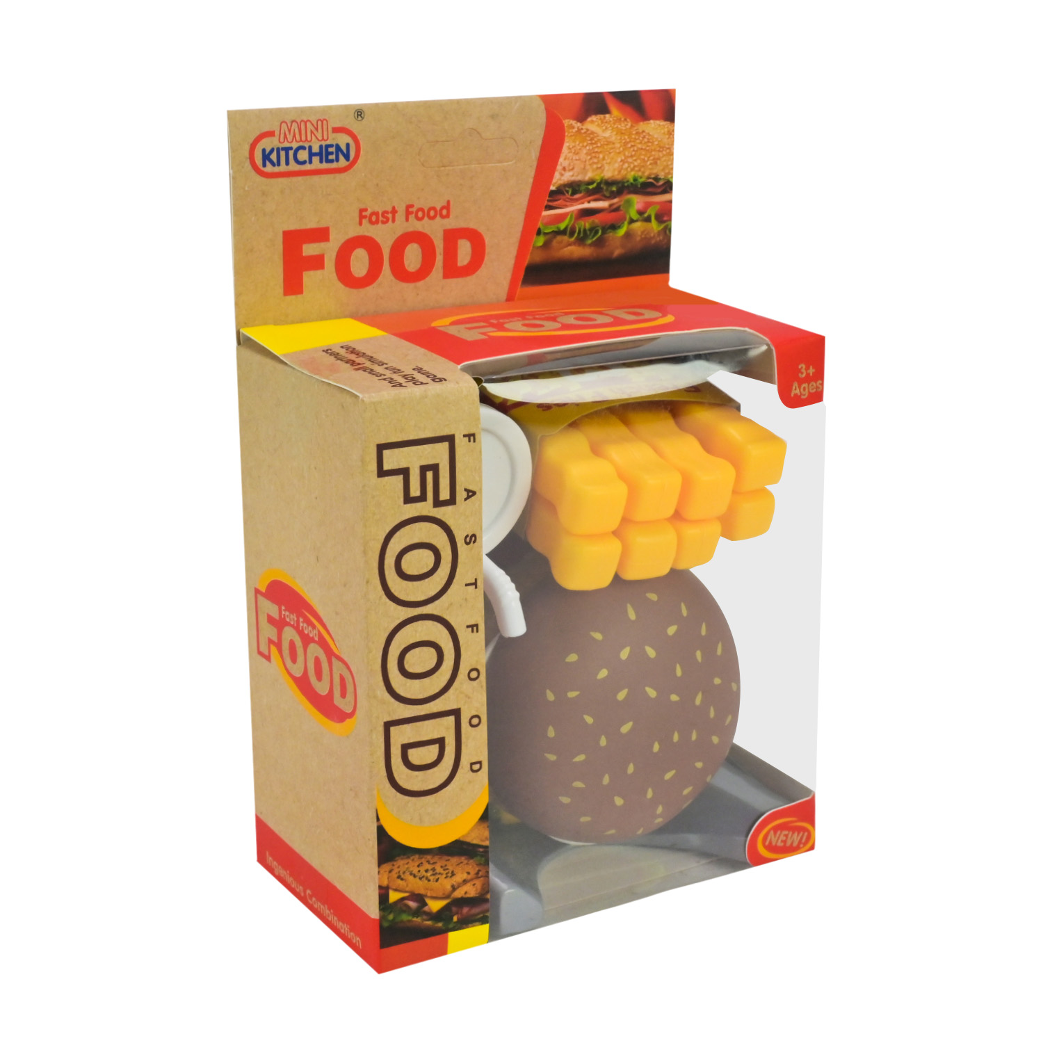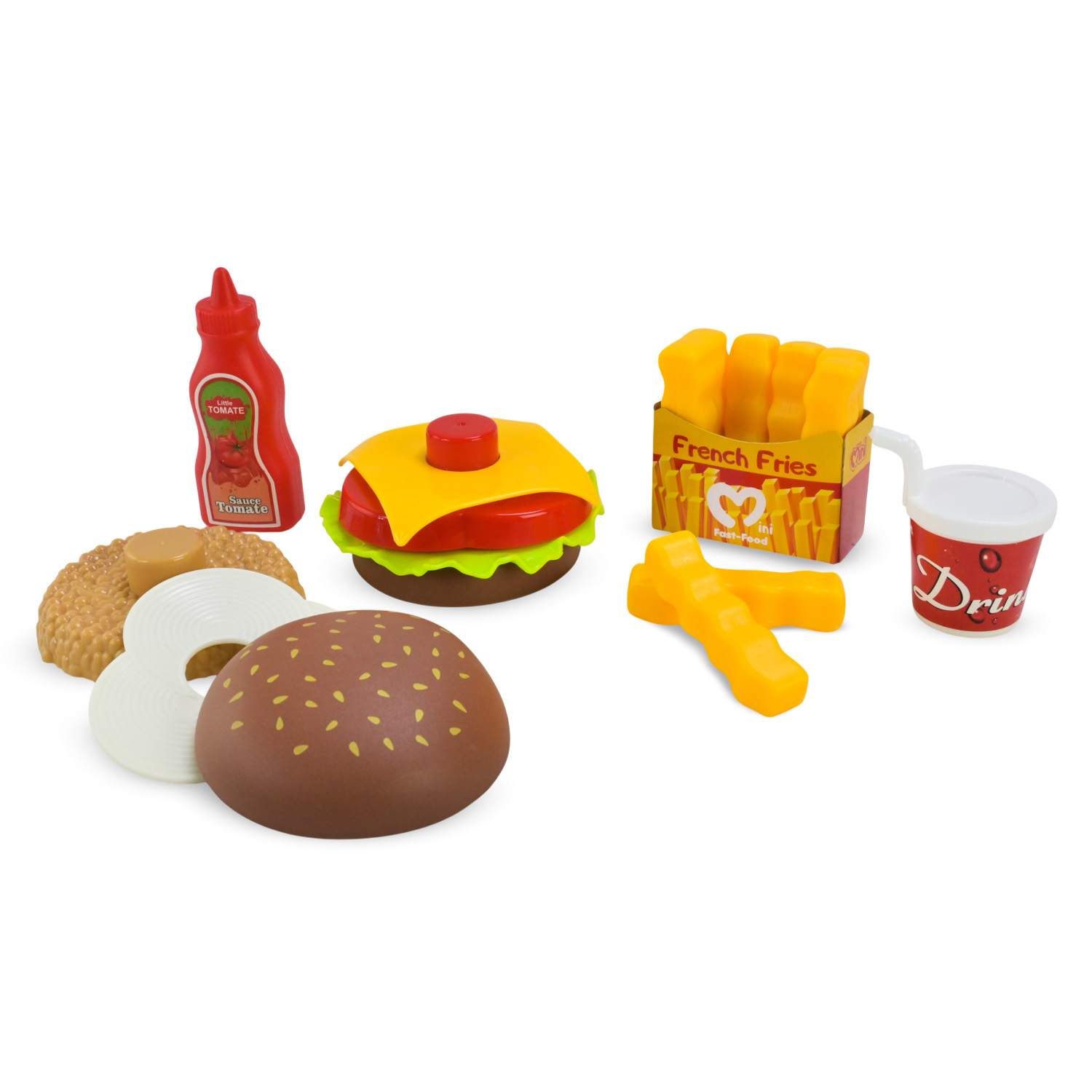 • У комплекті бургер, картопля фрі, пляшка кетчупу та напій для повної ігрової сцени.
