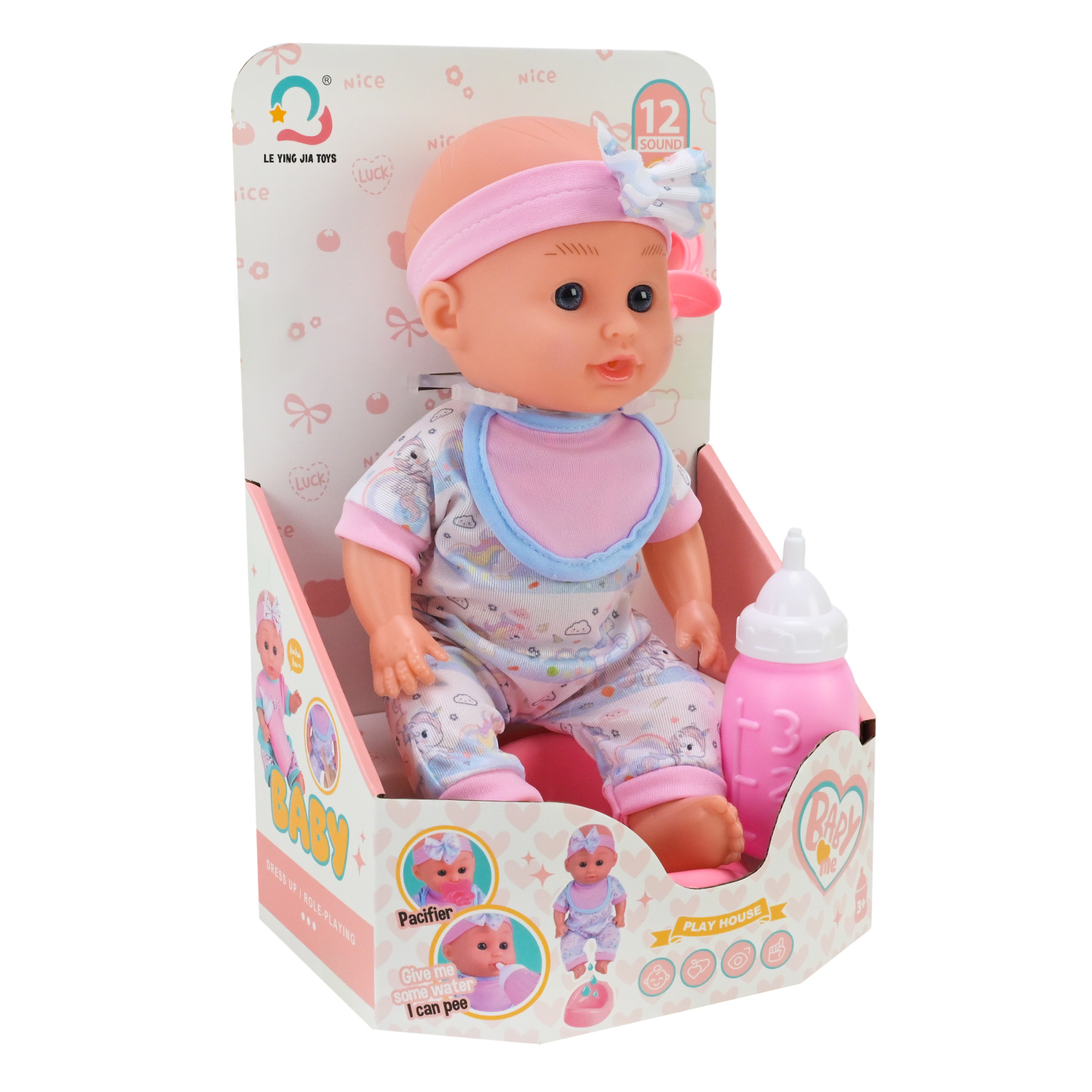 • Пупс вміє пісяти — у пляшку із поїлкою можна набрати воду та відтворити процес годування ляльки, після чого посадити її на горщик.
