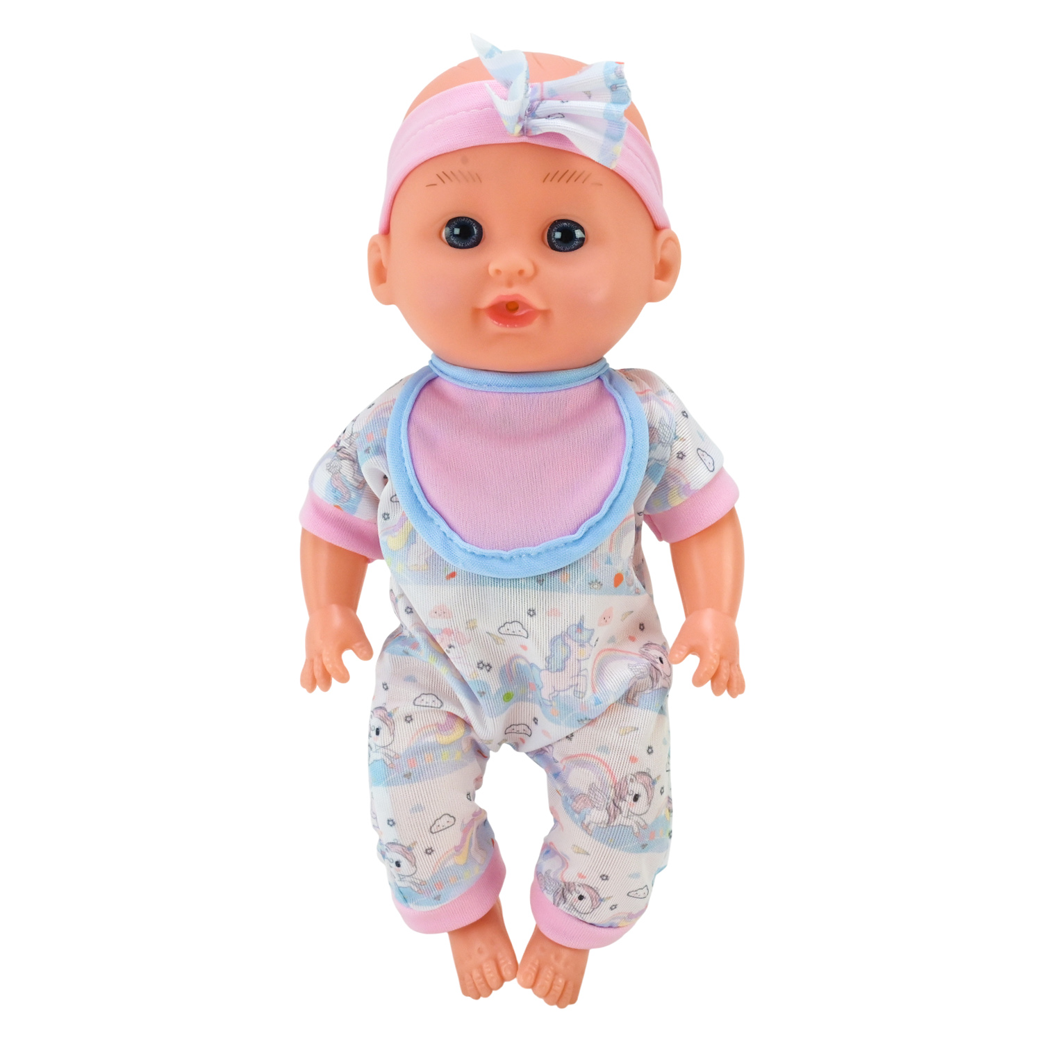 • Пупс має привабливий вигляд, одягнений у милий комбінезон із бантиком на голові, який доповнює образ.