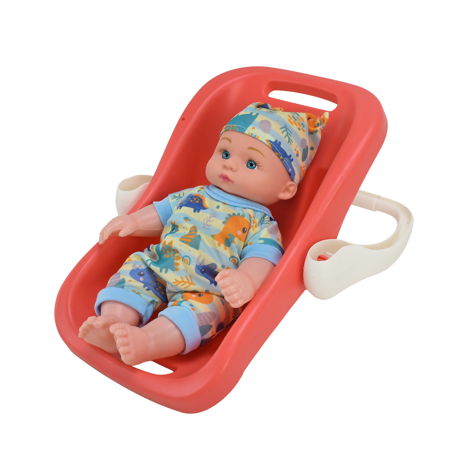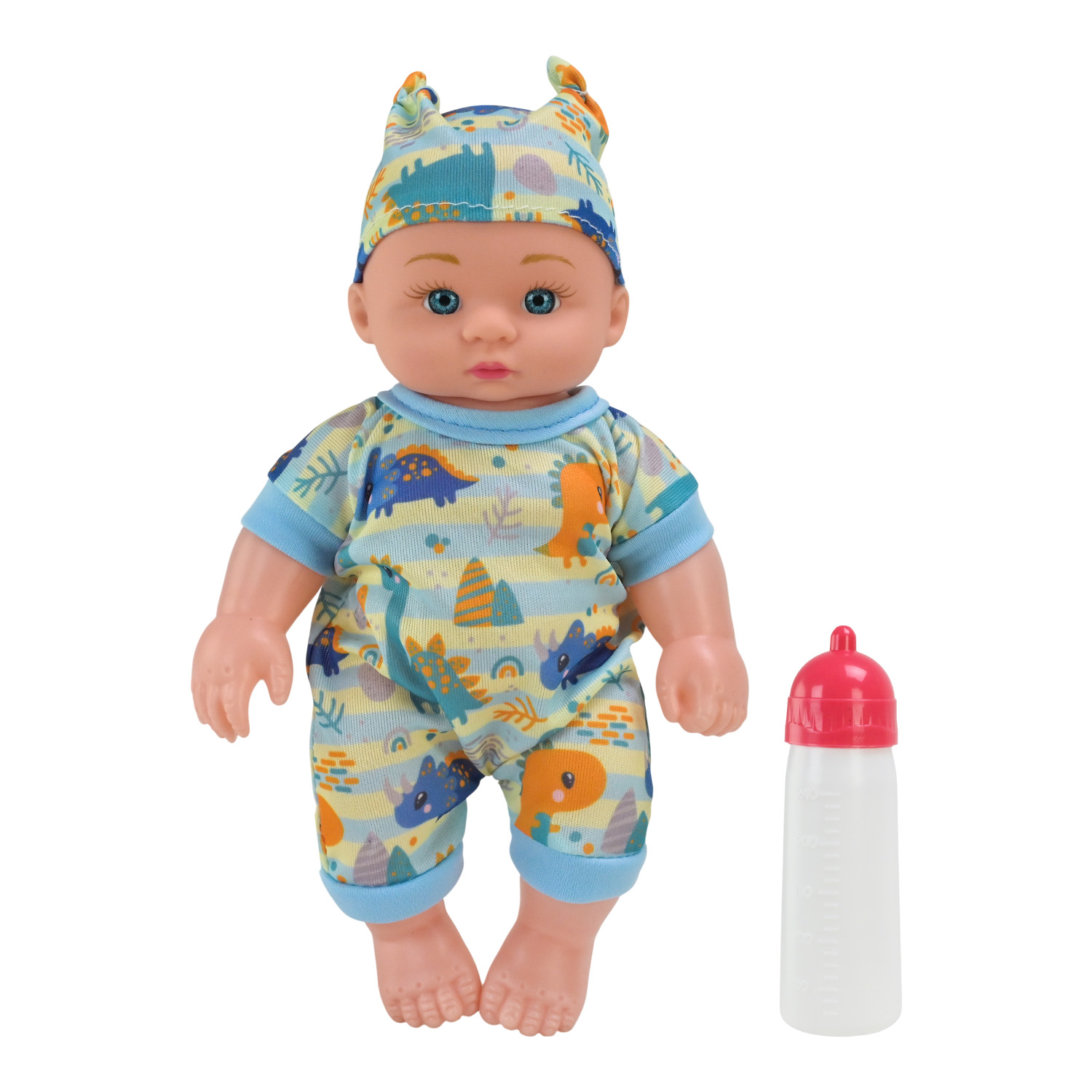 • Пупс має милий, привабливий вигляд — одягнений у барвистий комбінезон і капелюшок з зображенням динозаврів.