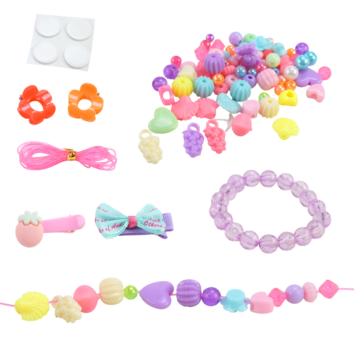 • Комплектація: набір має 40 елементів: різноманітні намистини, гумова волосінь для створення браслету, заколочки, браслет.