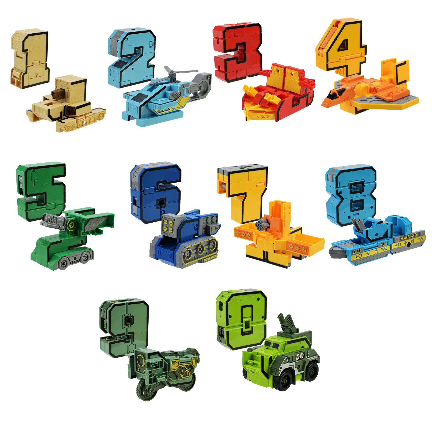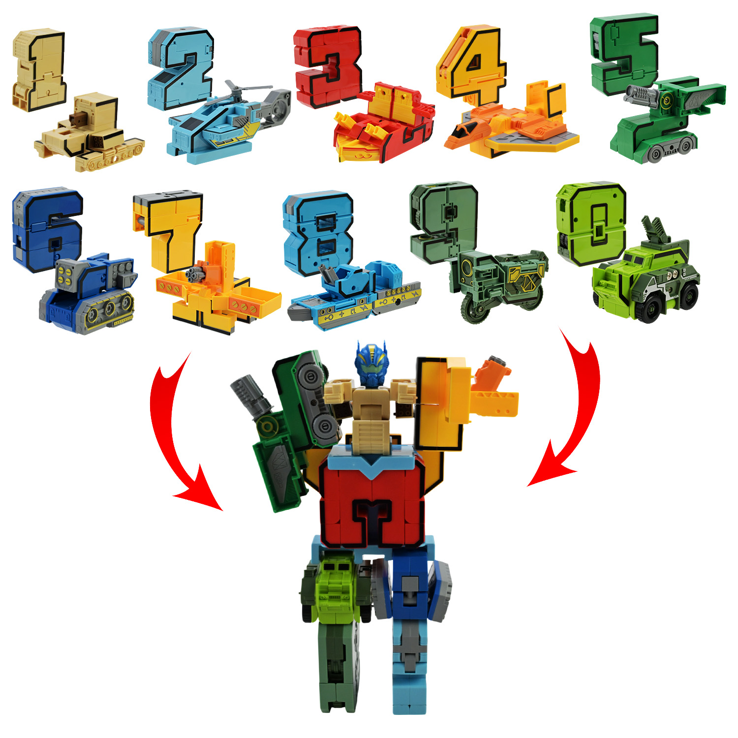Цифри ще ніколи не були такими захопливими! Кожна з них легко перетворюється на крутий транспорт — від потужних бойових машин до спеціалізованої техніки. Ця іграшка має унікальну особливість – це круте поєднання гри 2 в 1-му з вивчення цифр та трансформаціі.