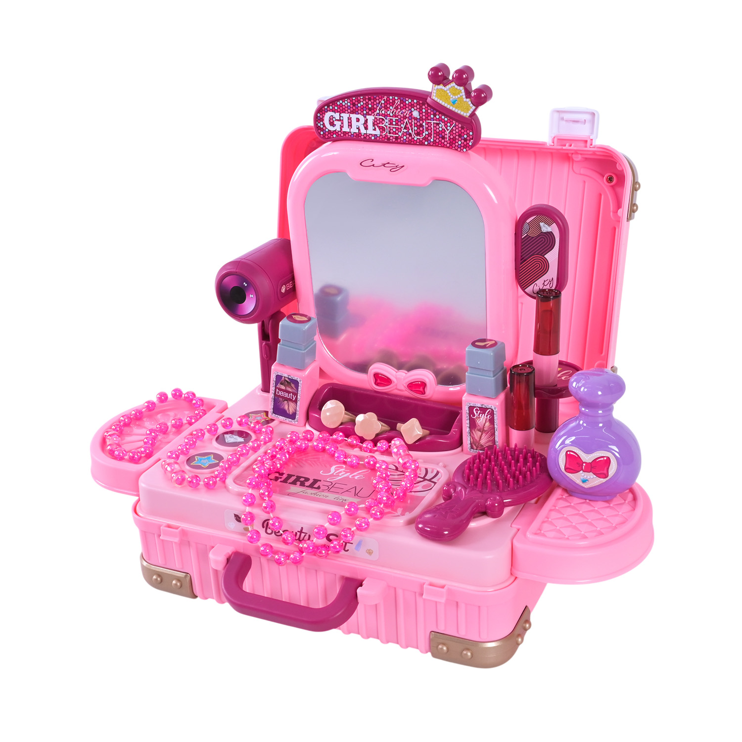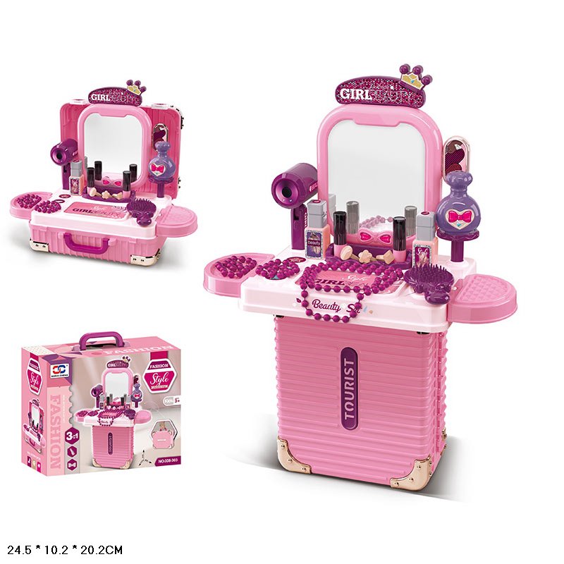 Стиль, гра і зручність в одному наборі! Це трюмо неодмінно сподобається юним модницям. У складеному вигляді — компактний чемоданчик, у розкладеному — міні-трюмо з дзеркалом і всіма необхідними аксесуарами. Такий набір не лише прикрасить гру, а й навчить дитину основ догляду за собою у веселій, творчій формі.