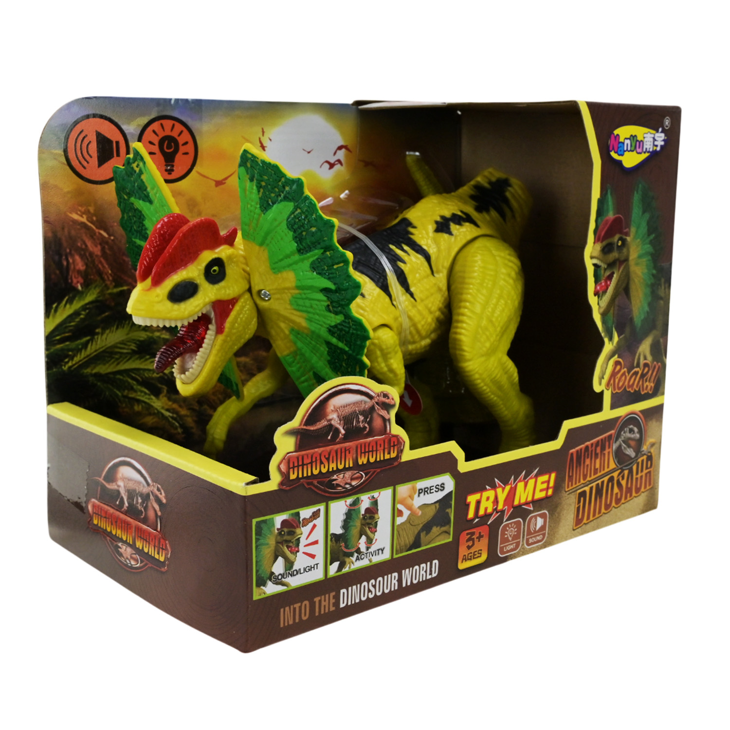 • Світлові ефекти — язик динозавра світиться червоним.