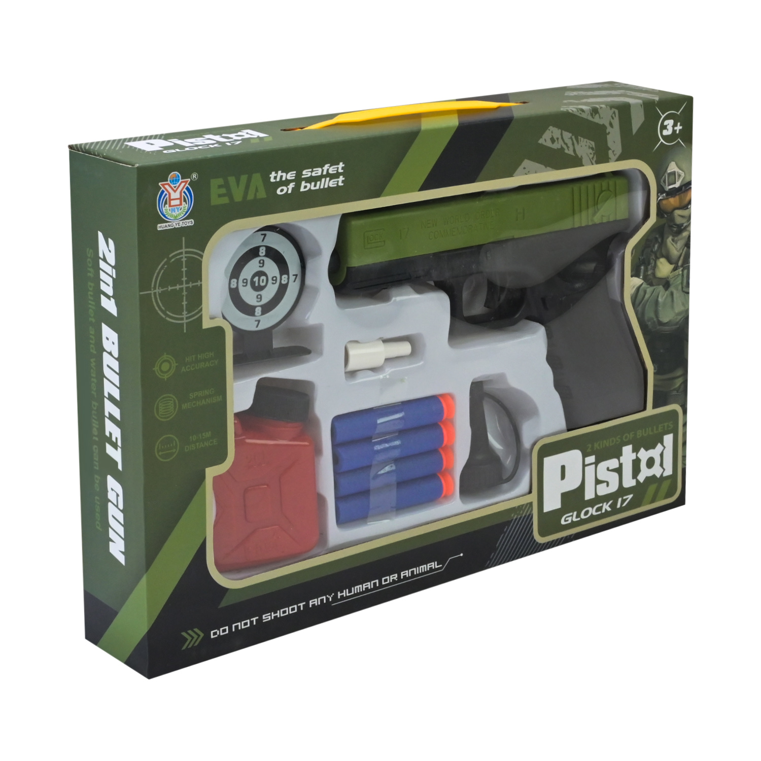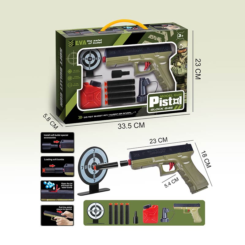 • Хлопчик за необхідністю може змінювати чим він хоче стріляти – пістолет может стріляти як поролоновими кульками з присосками, так і гелевими кульками.