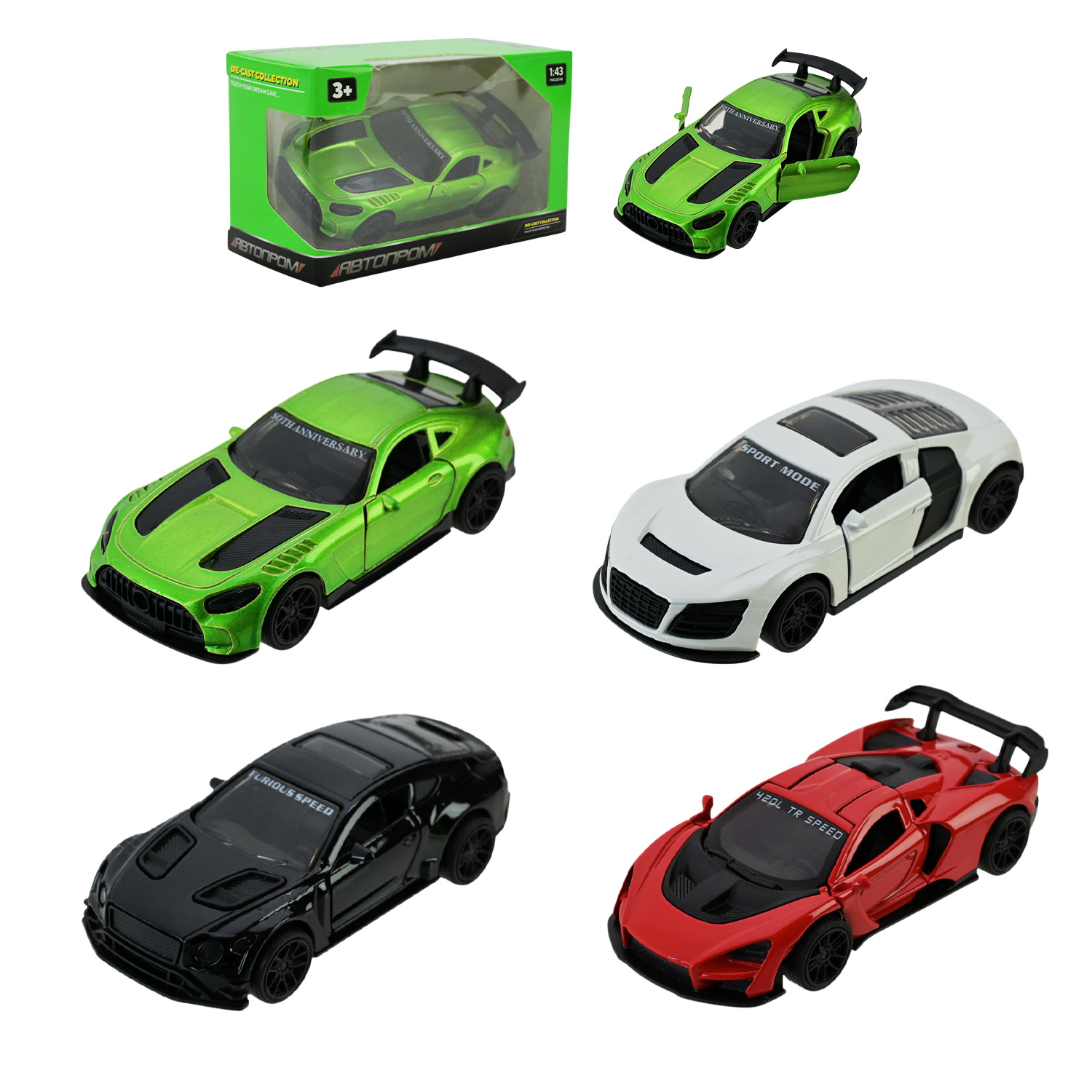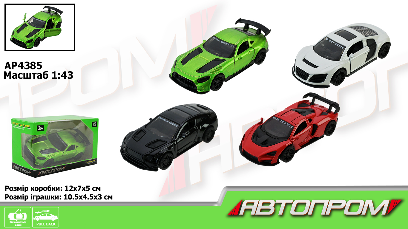 Машина металл.арт. AP4385 (96шт/2) 1:43,4 вида,откр.двери,в коробке 12*7*5см